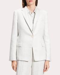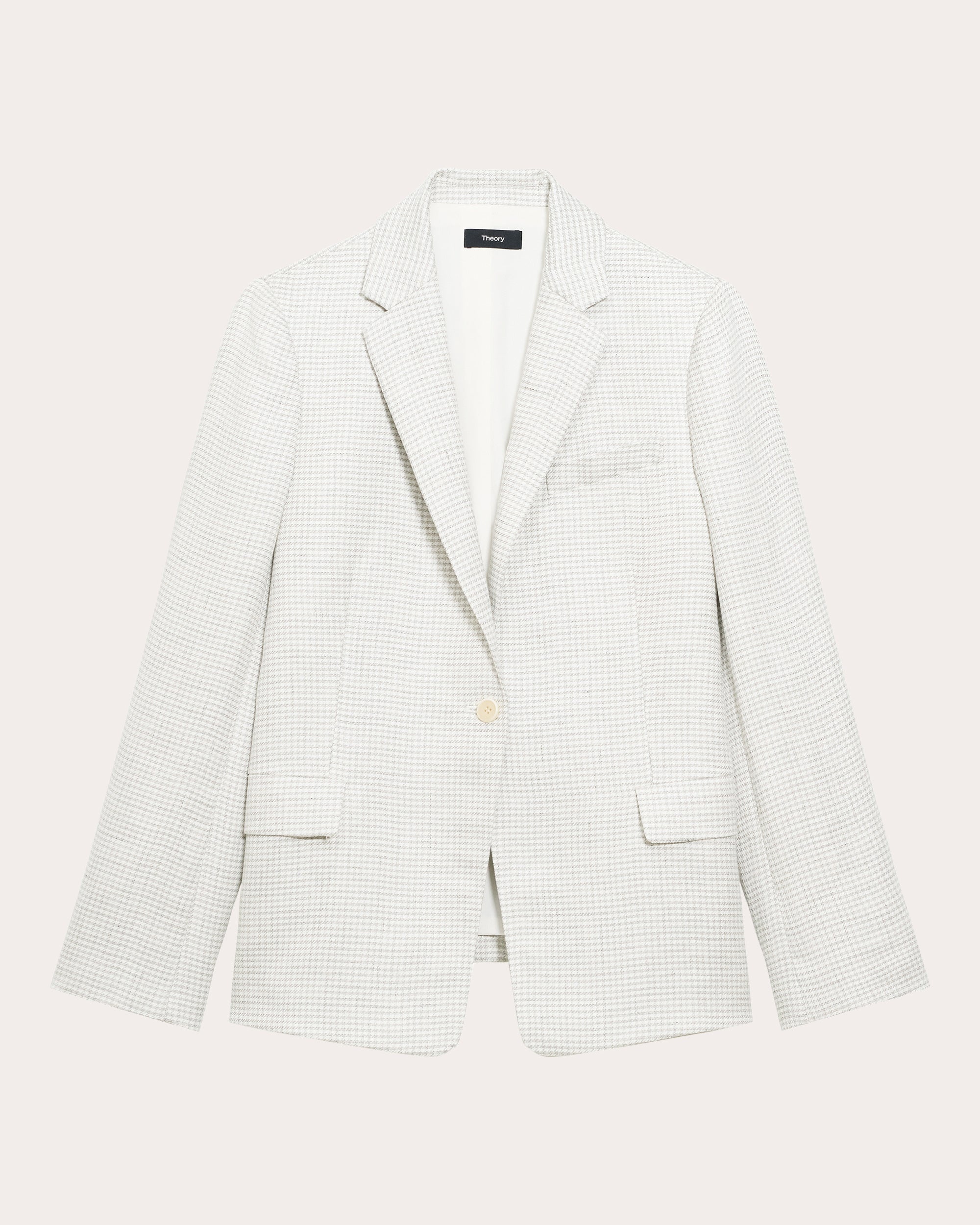 Rooted in traditional suiting, this houndstooth blazer details its linen-blend silhouette with notched lapels, front flap pockets and a vented back hem. Fastened with a single button, the bodice's darted seams create slim, tailored shape. Button closure Single-breasted Notched lapels Darted bodice seams Vented back hem Button sleeve cuffs Front flap pockets 52% linen, 43% viscose, 5% recycled viscose Dry clean only Made in Vietnam Size & Fit Fits true to size Please note, below measurements reflect Theory's size chart, not the actual garment. Size US 00: 31in bust, 24.5in waist, 34.25in hips Size US 0: 32in bust, 25.5in waist, 35.25in hips Size US 2: 33in bust, 26.5in waist, 36.25in hips Size US 4: 34in bust, 27.5in waist, 37.25in hips Size US 6: 35in bust, 28.5in waist, 38.25in hips Size US 8: 36in bust, 29.5in waist, 39.25in hips Size US 10: 37.5in bust, 31in waist, 40.75in hips Size US 12: 39in bust, 32.5in waist, 42.25in hips Size US 14: 40.5in bust, 34in waist, 43.75in hips Size US 16: 42in bust, 35.5in waist, 45.25in hips