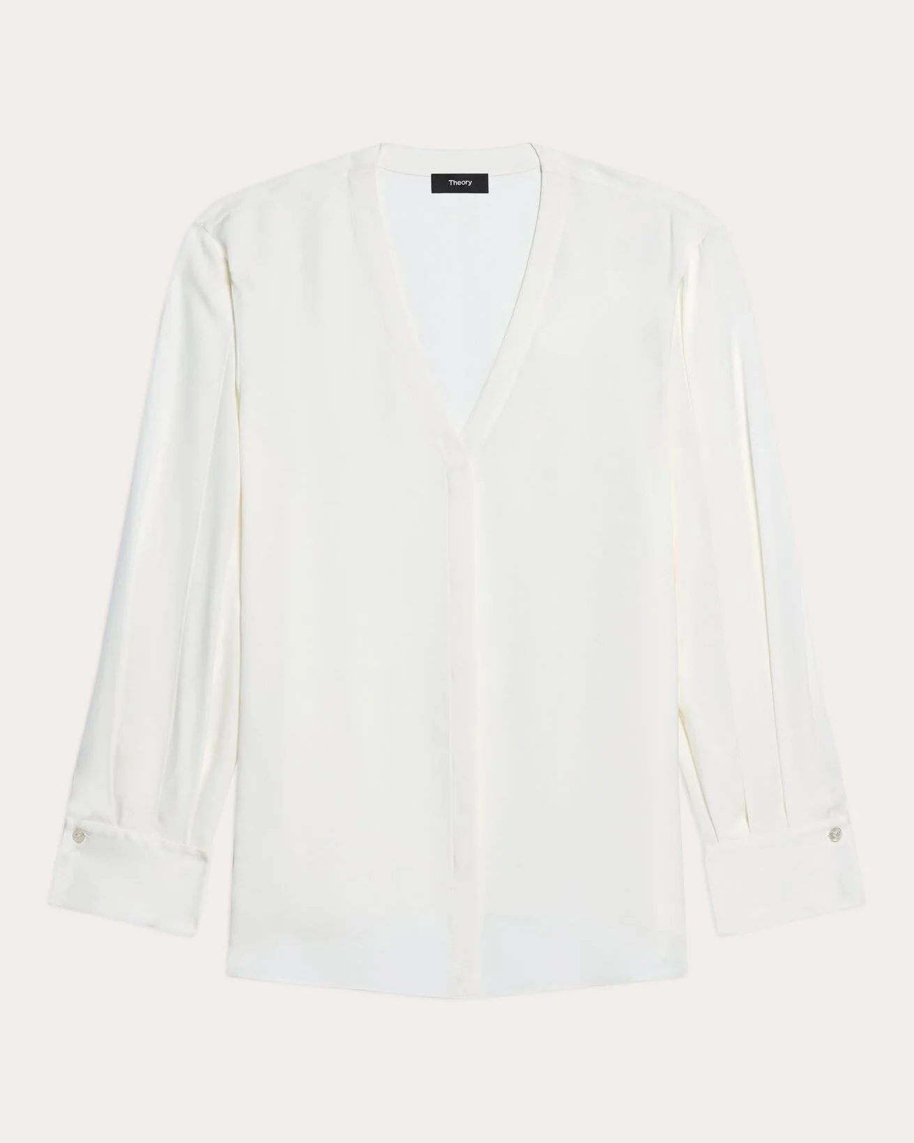 Brought to life in lightweight silk georgette, this Theory blouse emphasizes relaxed shape with its dropped shoulders and pleated, billowed sleeves. Split at the sides, the high-low hem creates a fluid finish. Designer color: ivory Concealed front button closure Dropped shoulders Pleated blouson sleeves with button cuffs Slit high-low hem Unlined Georgette 100% silk (OEKO-TEX® certified) Dry clean Made in China Size & Fit Garment measurements (size S): 25.25in long from high point of shoulder to hem, 39.2in bust Fits true to size Please note, below measurements reflect Theory's size chart, not the actual garment. Size P (XS): 31-32in bust, 24.5-25.5in waist, 34.25-35.25in hips Size S: 33-34in bust, 26.5-27.5in waist, 36.25-37.25in hips Size M: 35-36in bust, 28.5-29.5in waist, 38.25-39.25in hips Size L: 37.5-39in bust, 31-32.5in waist, 40.75-42.25in hips Size XL: 40.5-42in bust, 34-35.5in waist, 43.75-45.25in hips