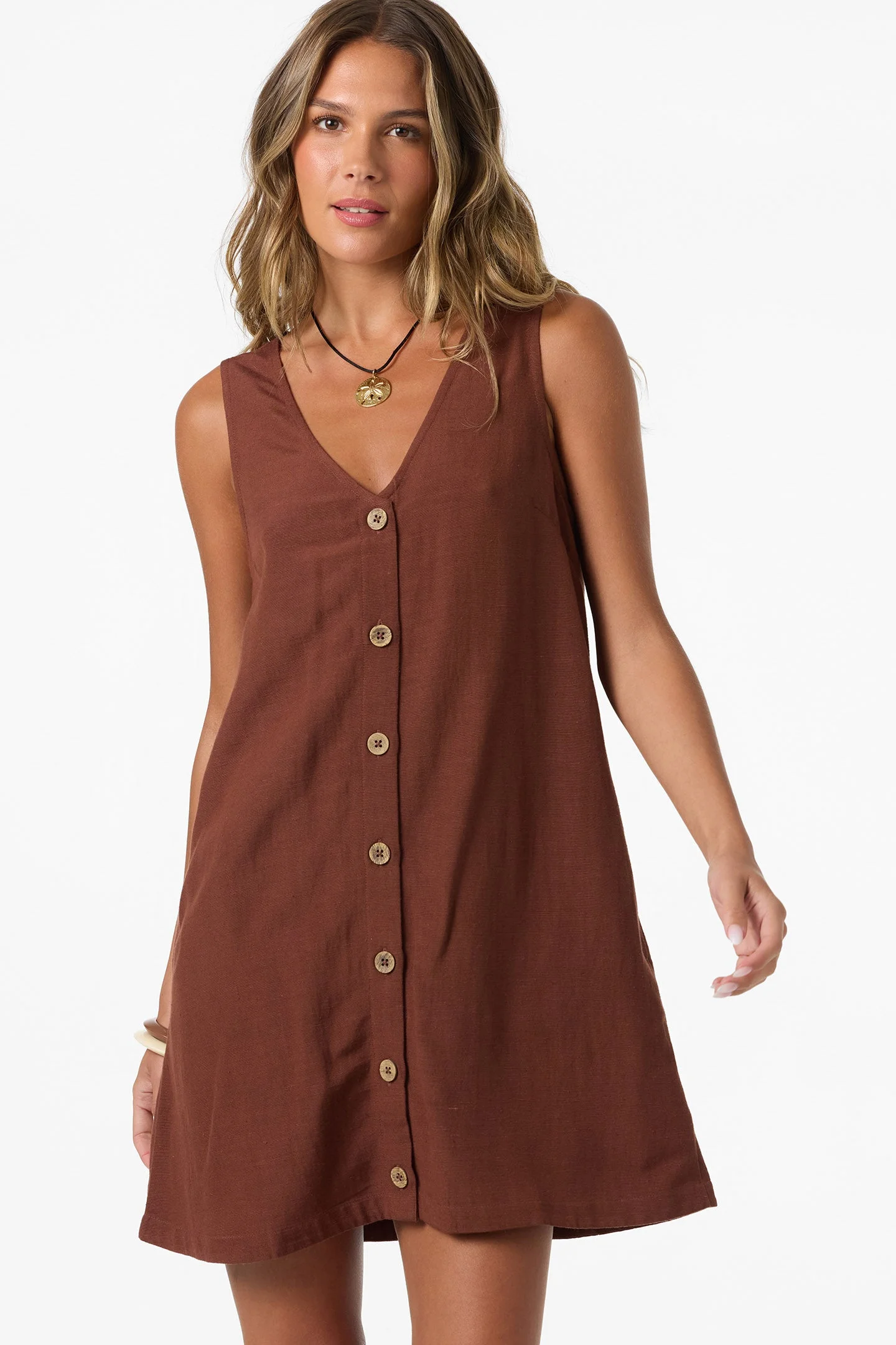 Simple, light, and effortless. This lightweight, flowy mini dress transitions seamlessly from beachside to city exploring. - Woven Short Dress - 55% Viscose, 30% Cotton, 15% Linen, 165 GSM - 23½'' Center Front Length - Button Front Placket - On-Seam Pockets SKU: SP2641609|CBR