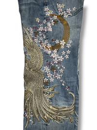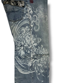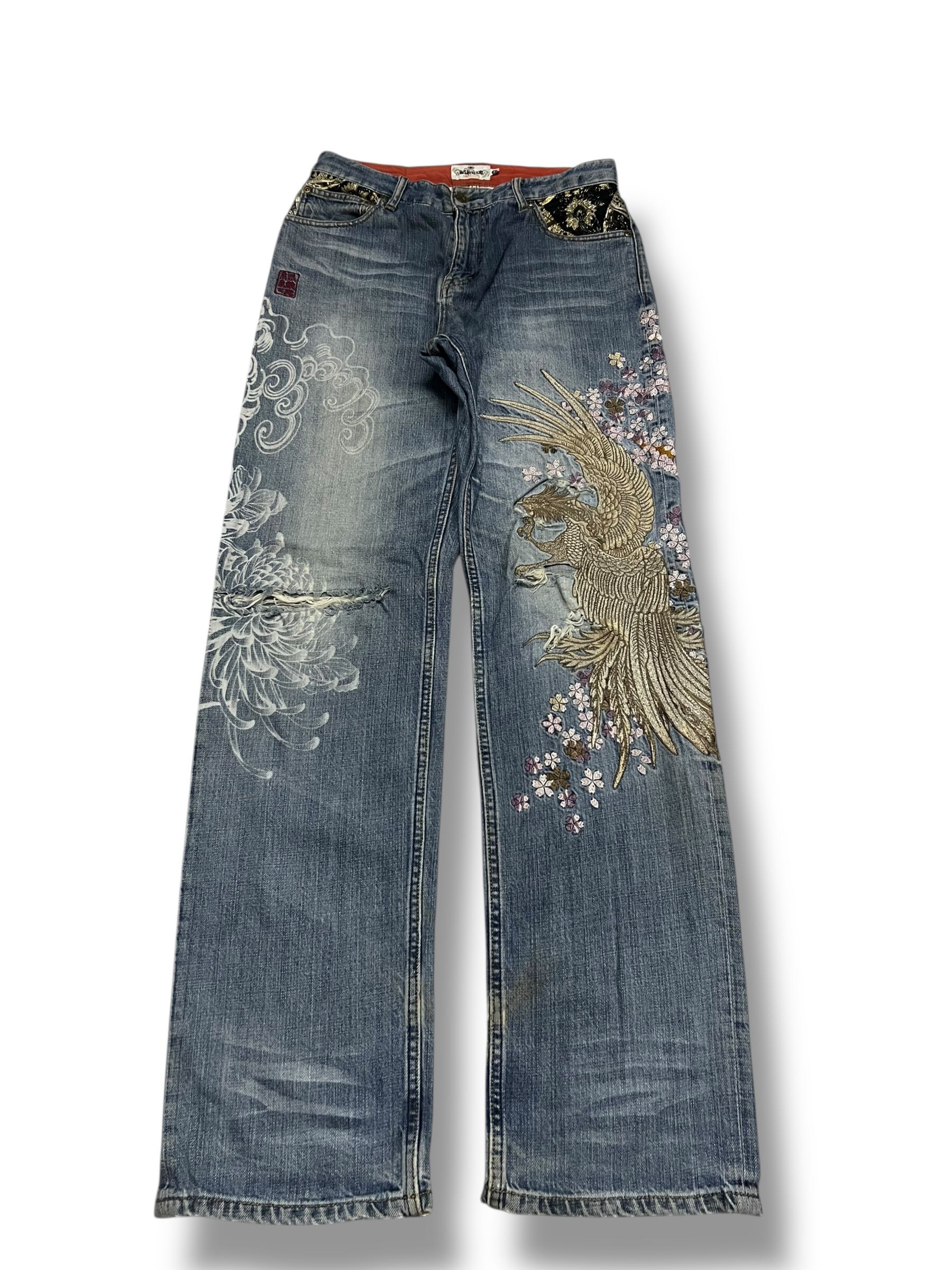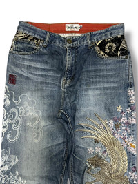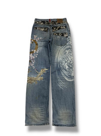 Karakuri Tamashi Wanokuni Phoenix Embroidered Jeans CODE : A2 Size : Tage 32 Style : Baggy Material : Refer photo Condition : Good Vintage Condition MEASUREMENT IN INCHES - WAIST : 16 - OUTSEAM : 44.5 - INSEAM: 32 - THIGH : 12 - KNEE : 9 - LEG OPENING : 8.8 - FRONT RISE : 12.5 DEAR VALUE CUSTOMER : * Please dont expect this item 100% like new unless i have mention it. REFUNDS : * No Exchange, No Refund, No Return And No Trades. All Sales Are Final. ATTENTION: * Please pay close attention to measurements provided. PAYMENT AND SHIPPING : * This item will be ship along with tracking number after received a complete payment (2-3 days after complete payment ) Thank you very much for your visit my store !!OFFER ME YOUR BEST PRICE NOW !! #hype #distresseddenim #japanesbrand #ifsixwasnine #tornadomart #kapital #hystericglamour #rickowens #midas #chromehearts #14addiction #maisonmargiela #balenciaga #undercover #juntakahashi #junyawatanabe #evisu #nike #levis #karakuritamashi
