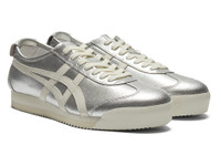 The "MEXICO 66 SD PF" is an updated version of the classic Onitsuka Tiger model "MEXICO 66 SD," featuring a comfortable sole with just the right amount of volume. The newly introduced silver color adds a touch of sophistication to any outfit. While retaining the iconic Onitsuka Tiger stripes and cross-piece on the heel, this model is crafted from soft, premium leather, giving it a luxurious finish. A versatile shoe that blends retro charm with modern flair, it suits both casual daily wear and dressier occasions. -Kid leather upper -Heel wedge equipped with fuzeGEL for shock absorption -OrthoLite insole for superior cushioning -Outer sole made with a specially formulated material for enhanced comfort DETAIL INFORMATION - Brand: Onitsuka Tiger - Country of Manufacture: Vietnam - Part No: 1183C156 - 1183C156.020 PURE SILVER/CREAM - Upper material/surface: LEATHER - Outer Sole Material: RUBBER