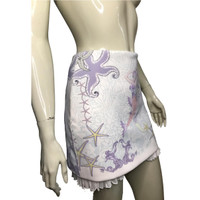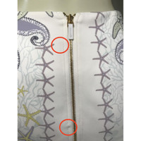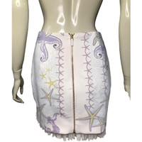 Runway Versace SS 2012, look 5 mermaid and starfish print skirt with ruffle hem Worn in size medium mannequin marked size 38 flatly laid measurements: waist 13” length 15” center back metallic zipper with logo 48% nylon 34% polyester 18% elastane lining 100% silk lining 100% viscose **See photos of the minor stains Details Online since:2024-06-12 Categories: women Category: Clothing Sub-category: Skirts Designer: Versace Condition: 0 Material: Synthetic Colour: Multicolour Size: 38 IT Location: empty Reference: 45044749 Measurements Length: 15in Width: 13in