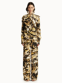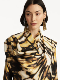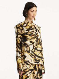 This silk twill blouse features an abstract butterfly motif, evoking the delicate unfolding of wings. The draped neckline and long sleeves add a touch of fluid elegance, while the bold print and refined silhouette make it a versatile piece that transitions effortlessly from day to evening. Details - Long Sleeves with Button Cuffs - Draped Neckline - Side Slits - Scarf Detail - Pullover Style - Relaxed Silhouette - Unlined - Style Code: 25PN720ABT_BKU - Country of Origin: USA Materials & Care - 100% Silk
