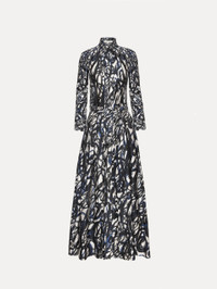 Silk twill brings the Abstract Sketch motif to life, its inky strokes evoking the gesture of hand-drawn art. A softly draped tie neckline and pleated skirt strike a refined balance of polish and ease, offering an effortlessly elevated way to wear bold artistry. Details - Long Sleeves with Button Cuffs - Mock Neckline with Self-Tie Closure - Coordinating Buckle Belt - Unlined - Country of Origin: Italy - Style Code: 26RN211LBI_NVW Materials & Care - 100% Silk - Dry clean only.