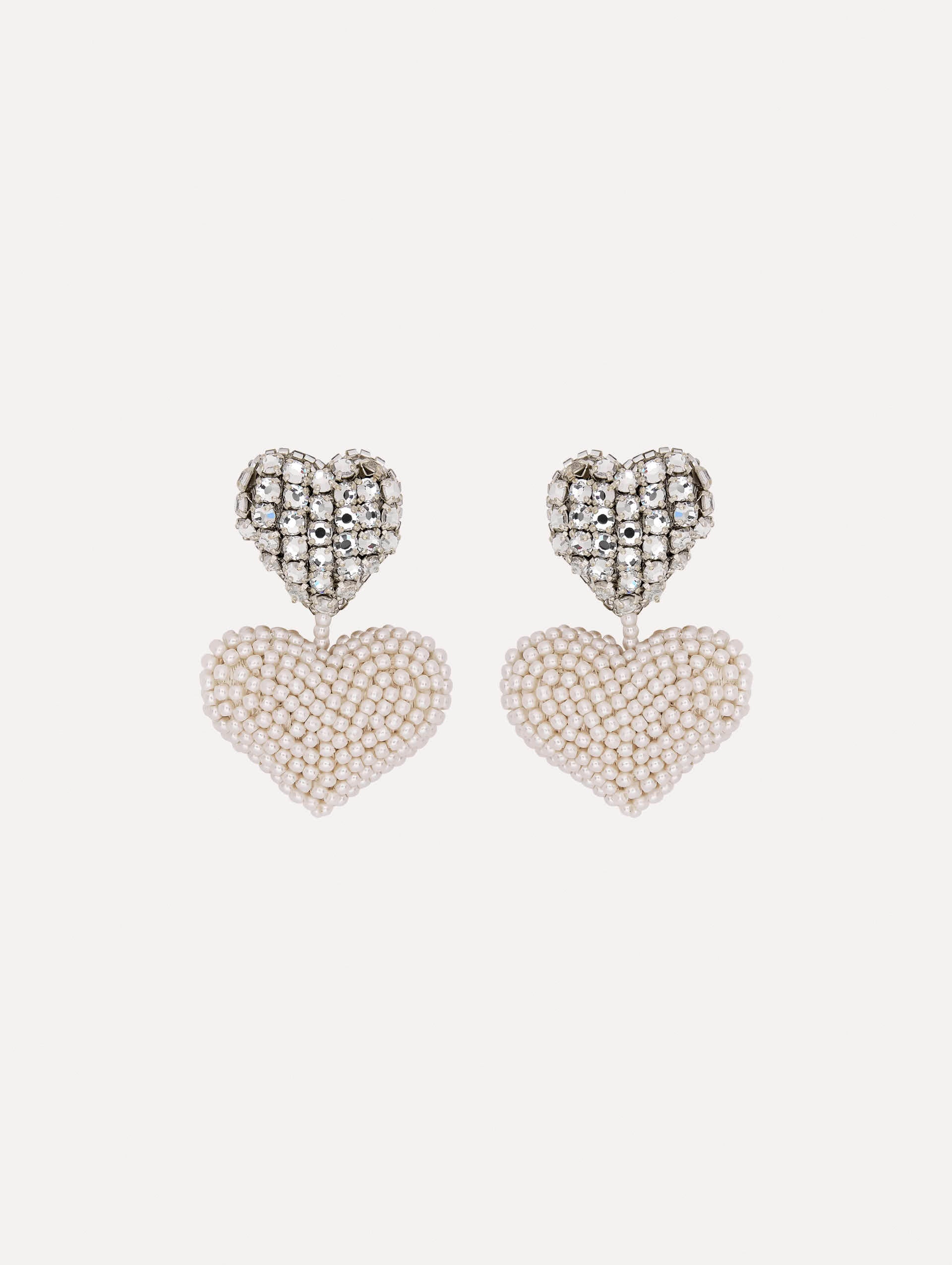 A crystal-encrusted heart anchors this playful yet polished design, dropping to a second heart meticulously beaded in lustrous pearls. The contrast of sparkle and texture creates a striking balance of romance and refinement. Details - Dimensions: 4.5 cm x 3 cm - Weight: 8 grams - Clip Backs with Comfort Pads - Style Code: F25J185_CRT - Country of Origin: India Materials & Care - - 40% Glass, 30% Plastic, 5% Resin, 5% Silk, 5% Polyester, 15% Brass - - Avoid exposing your jewelry to harsh chemicals. - - Lotions, cosmetics, hairspray and perfumes can cause chemical reactions that can cause the finish to deteriorate. - - Before handling, washing hands after applying makeup and hair products will help to preserve the finish. - - Do not wear in the pool, on the beach or in the shower. - - Wipe away dirt and body oils with a slightly damp microfiber jewelry cloth or cotton ball and allow to dry. - - Store separately in cloth pouches or small boxes to minimize scratching.