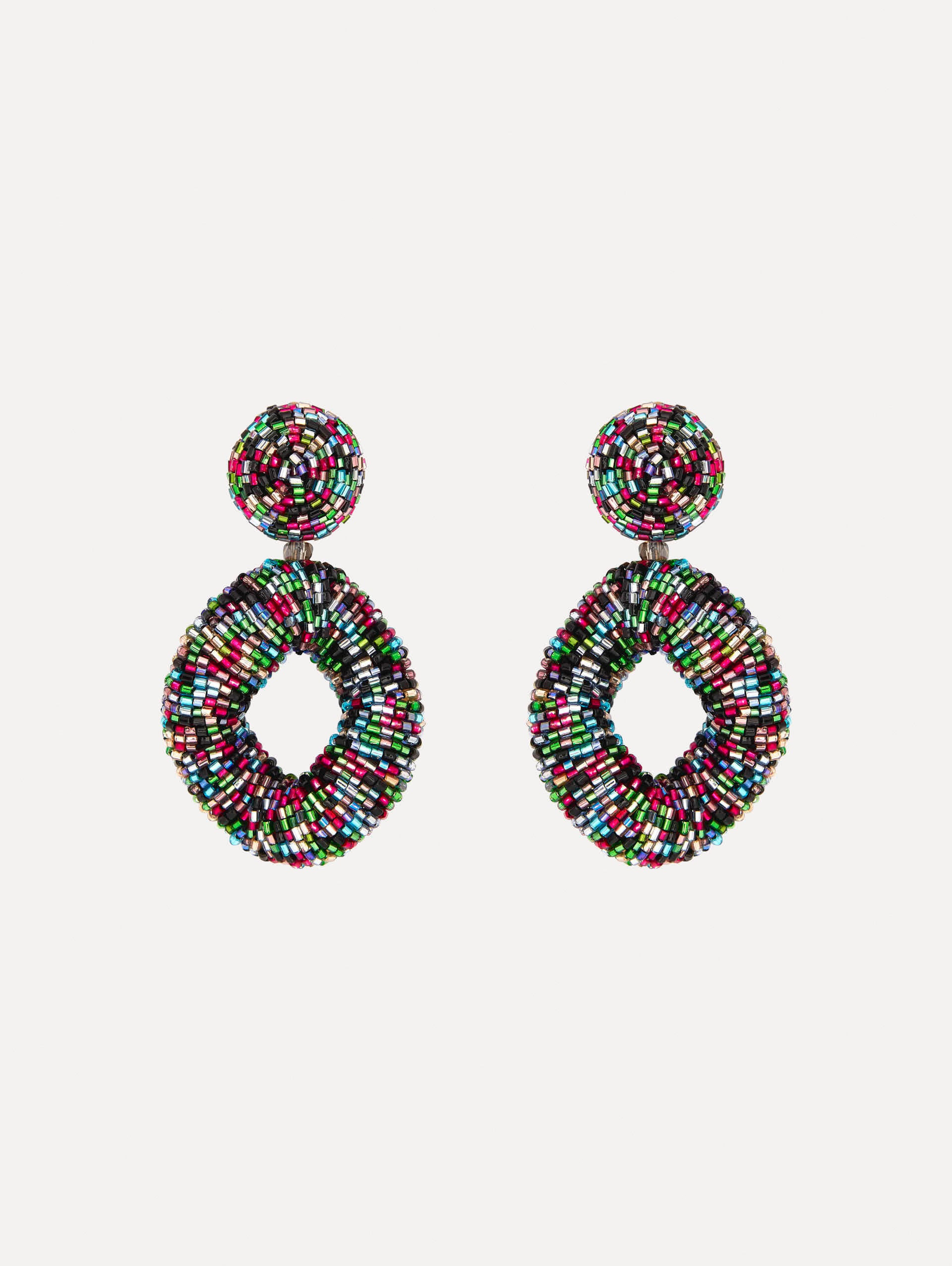 These hand-beaded earrings feature jet-black bugle beads in a bold, open-loop silhouette that catches the light with every move. Pair with swept-back hair to keep their statement in focus. Details - Dimensions: 6.6 cm x 3.7 cm - Weight: 28 grams - Clip Backs with Comfort Pads - Style Code: F25J200_MUL - Country of Origin: India Materials & Care - - 60% Glass, 10% Acrylic, 10% Viscose, 10% Polyester, 10%Brass - - Avoid exposing your jewelry to harsh chemicals. - - Lotions, cosmetics, hairspray and perfumes can cause chemical reactions that can cause the finish to deteriorate. - - Before handling, washing hands after applying makeup and hair products will help to preserve the finish. - - Do not wear in the pool, on the beach or in the shower. - - Wipe away dirt and body oils with a slightly damp microfiber jewelry cloth or cotton ball and allow to dry. - - Store separately in cloth pouches or small boxes to minimize scratching.