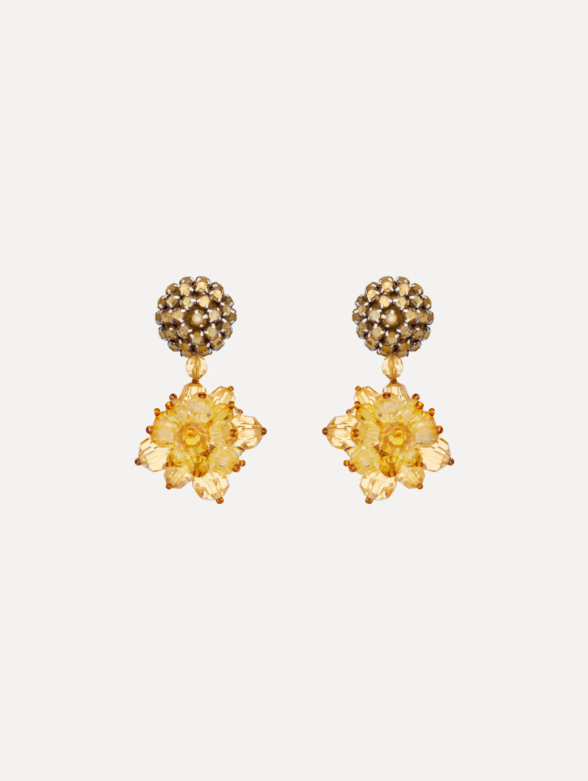 These earrings feature a beaded pompom stud that gives way to a sculpted drop formed from clustered, faceted beads in translucent topaz. The intricate construction catches the light from every angle, creating a bold yet delicate sense of movement. Details - Dimensions: 6 cm x 2.75 cm - Weight: 30 grams - Clip Back with Comfort Pads - Country of Origin: India - Style Code: R26J196_TOP Materials & Care - 55% Plastic, 17% Brass, 15% Glass, 10% Metal, 3% Nylon - Avoid exposing your jewelry to harsh chemicals. - Lotions, cosmetics, hairspray and perfumes can cause chemical reactions that can cause the finish to deteriorate. - Before handling, washing hands after applying makeup and hair products will help to preserve the finish. - Do not wear in the pool, on the beach or in the shower. - Wipe away dirt and body oils with a slightly damp microfiber jewelry cloth or cotton ball and allow to dry. - Store separately in cloth pouches or small boxes to minimize scratching.