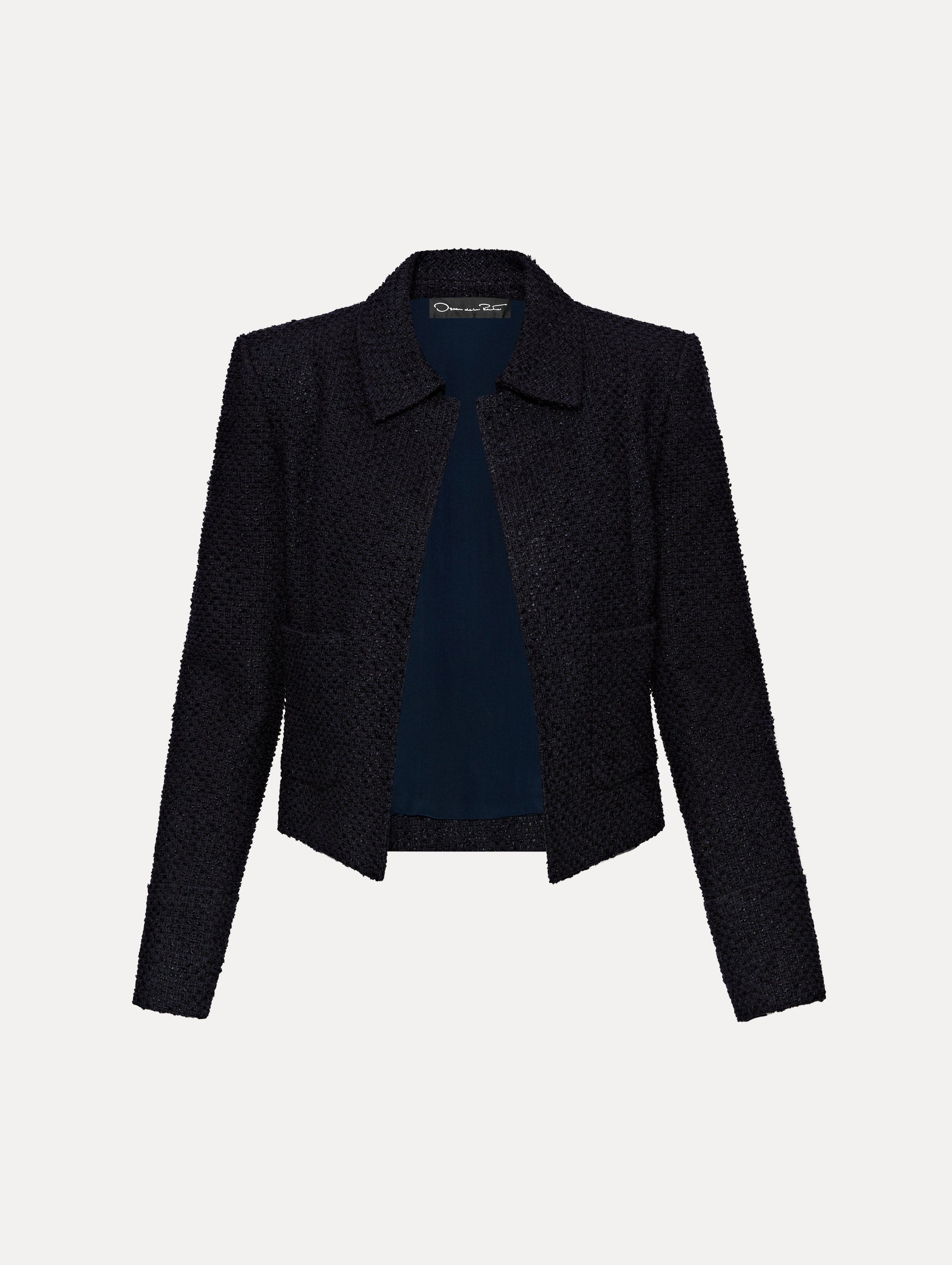 TAILORED FROM TEXTURED BOUCLE TWEED, THIS CLASSICALLY HUED JACKET FEATURES A CRISP COLLAR AND WILL BE THE PERFECT LATER FOR DAY OR NIGHT. LONG SLEEVES / COLLARED NECKLINE / OPEN FRONT / FRONT POCKETS / DRY CLEAN DIMENSIONS: MODEL IS 5'10.5" / 180 CM AND WEARING SIZE 2 MATERIAL: 65% COTTON, 30% VISCOSE, 5% POLYAMIDE MADE IN USA STYLE 23CN505SBW_DKN