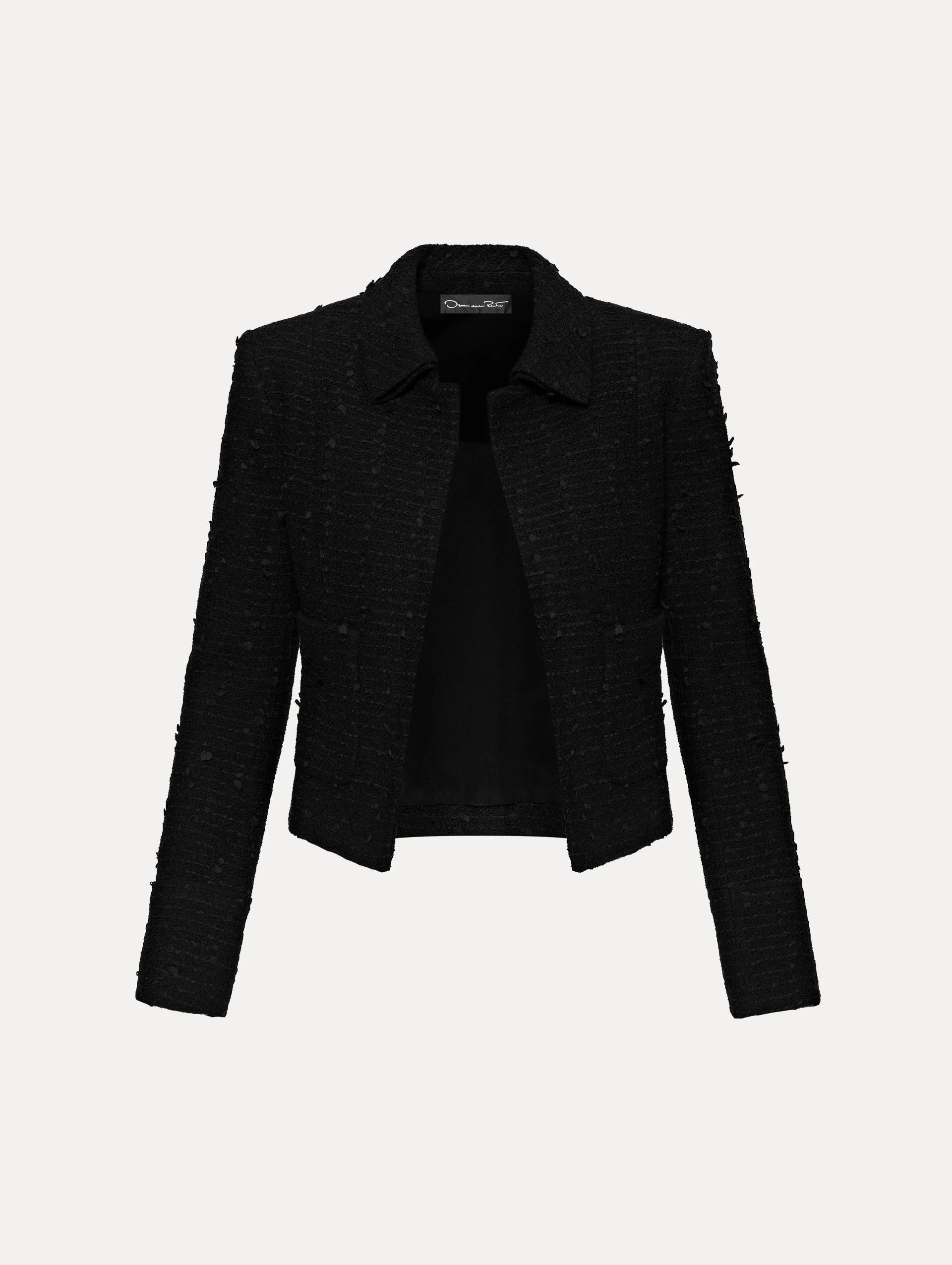TAILORED FROM TEXTURED BOUCLE TWEED, THIS CLASSICALLY HUED JACKET FEATURES A CRISP COLLAR AND WILL BE THE PERFECT LATER FOR DAY OR NIGHT. LONG SLEEVES / COLLARED NECKLINE / OPEN FRONT / FRONT POCKETS / DRY CLEAN DIMENSIONS: MODEL IS 5'10.5" / 180 CM AND WEARING SIZE 2 MADE IN USA STYLE 23CN505LRT_BLK