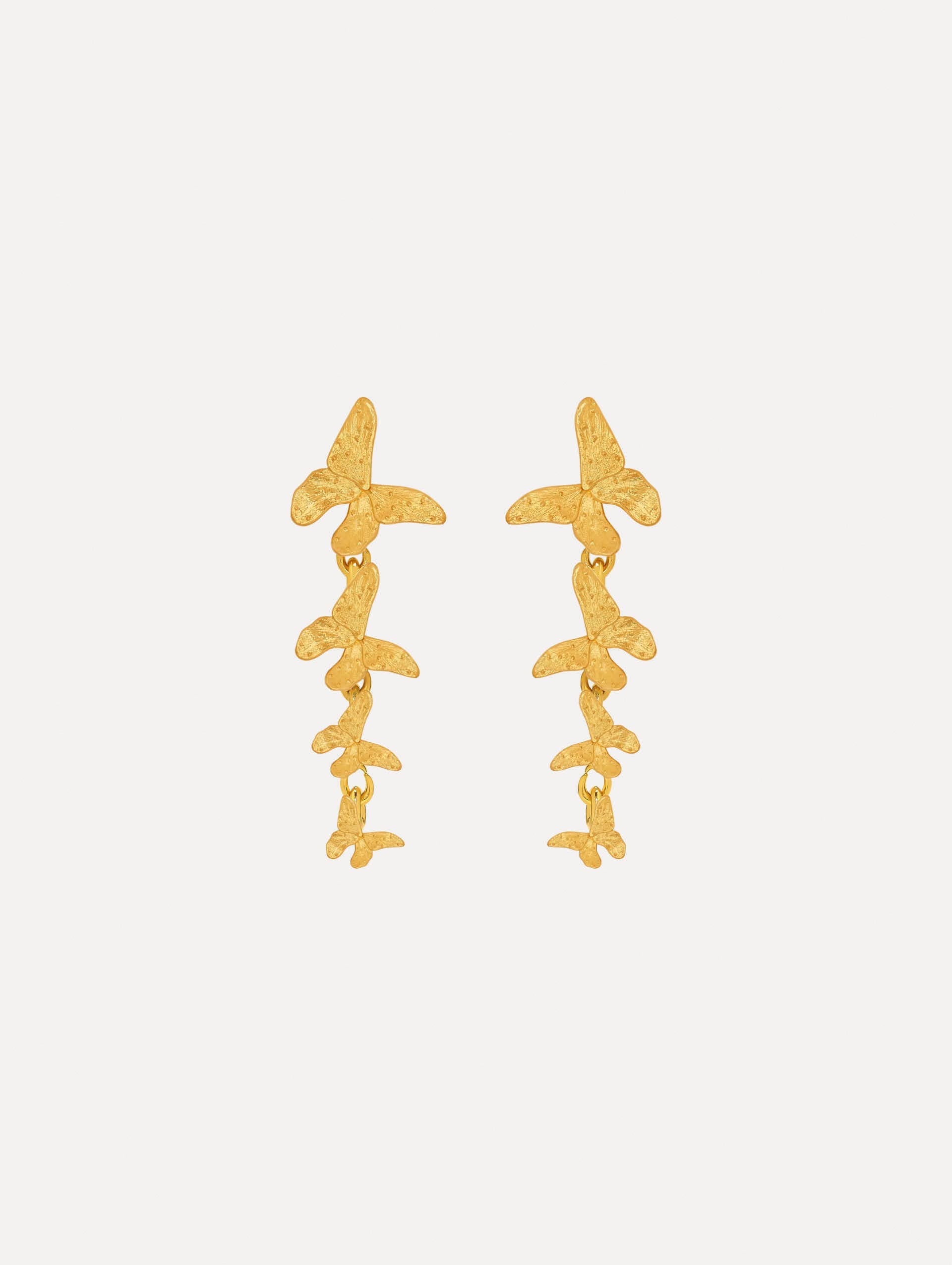 These gold butterfly drop earrings create a cascading effect, with an artful arrangement of butterflies that appear to drift weightlessly. Pair with the coordinating ring or bracelet. Details - Dimensions: 83 mm x 28 mm - Weight: 18 grams - Post Backs - For Pierced Ears - Style Code: P25J930_GOL - Country of Origin: Italy Materials & Care - 100% Brass
