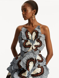 A breathtaking display of artistry, this cocktail dress is adorned with three-dimensional threadwork butterflies, each intricately embroidered for a lifelike, fluttering effect. Details - Strapless - Cupcake Silhouette - Concealed Back Zipper - Internal Bustier with Petticoat - 100% Silk Lining - Style Code: 25PE687TUL_BMM - Country of Origin: USA Materials & Care - 100% Polyamide; Lining: 100% Silk