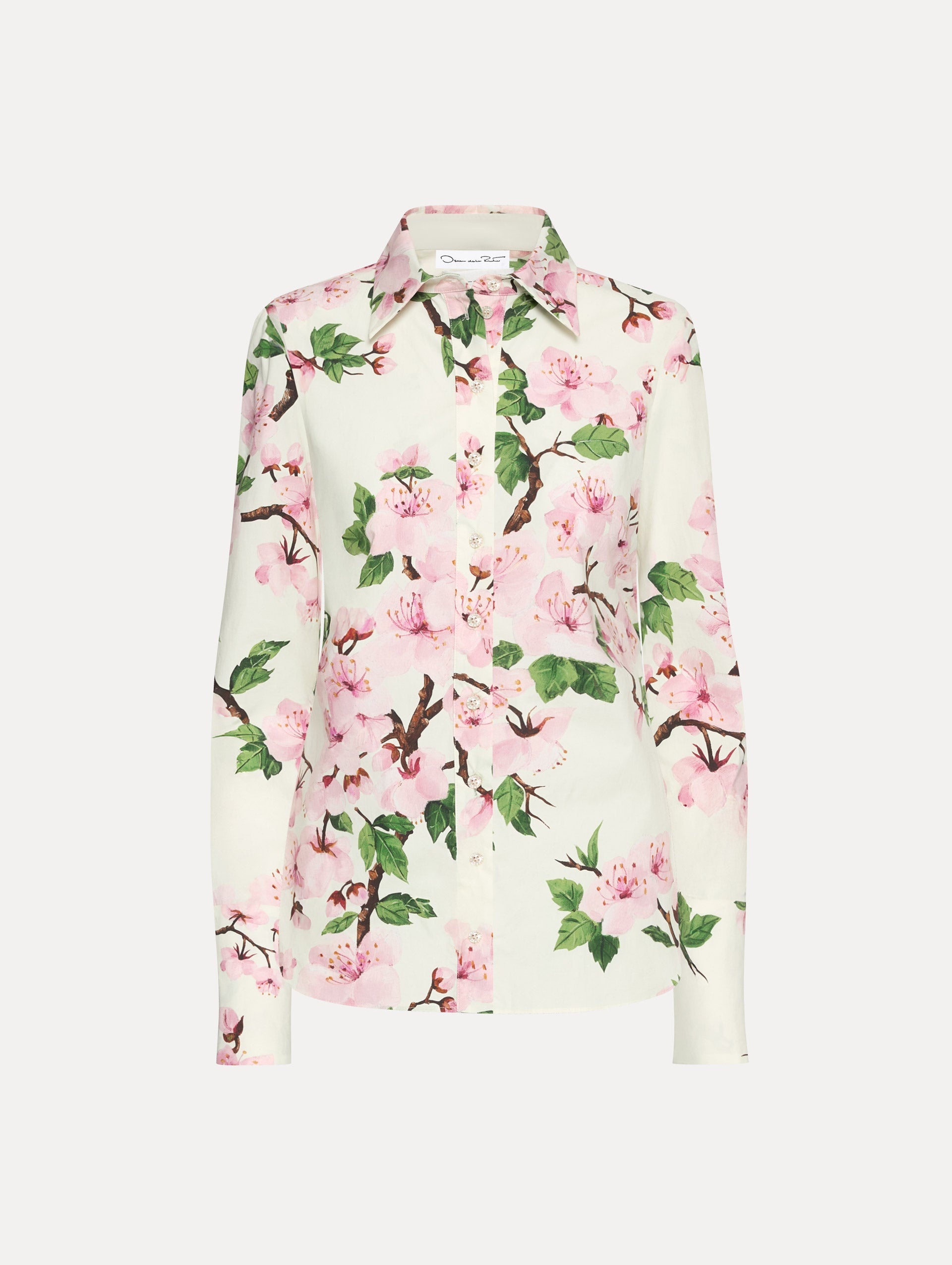 Crafted from crisp cotton poplin, this blouse is printed with all-over cherry blossoms that add a feminine touch. Long sleeves and a spread collar bring timeless structure, while the button-front design adds a touch of refinement. Details - Long Sleeves with Button Cuffs - Spread Collar - Button Front - Shirt Tail Hemline - Self-Tie Back Detail - Unlined - Style Code: 25PN744CBO_PKV - Country of Origin: Italy Materials & Care - 97% Cotton, 3% Elastane