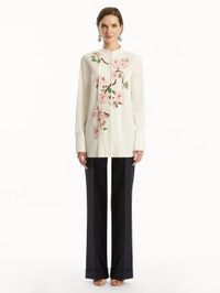 Crafted from crisp white cotton poplin, this blouse features intricate pleating at the front, enhanced by delicate pink cherry blossoms that decorate the folds. A banded collar and long sleeves bring a structured, timeless elegance, making this piece a refined balance of feminine charm and classic tailoring. Details - Long Sleeves with Button Cuffs - Banded Collar - Button Front - Shirt Tail Hemline - Unlined - Style Code: 25PN707COB_PIW - Country of Origin: Italy Materials & Care - 97% Cotton, 3% Elastane