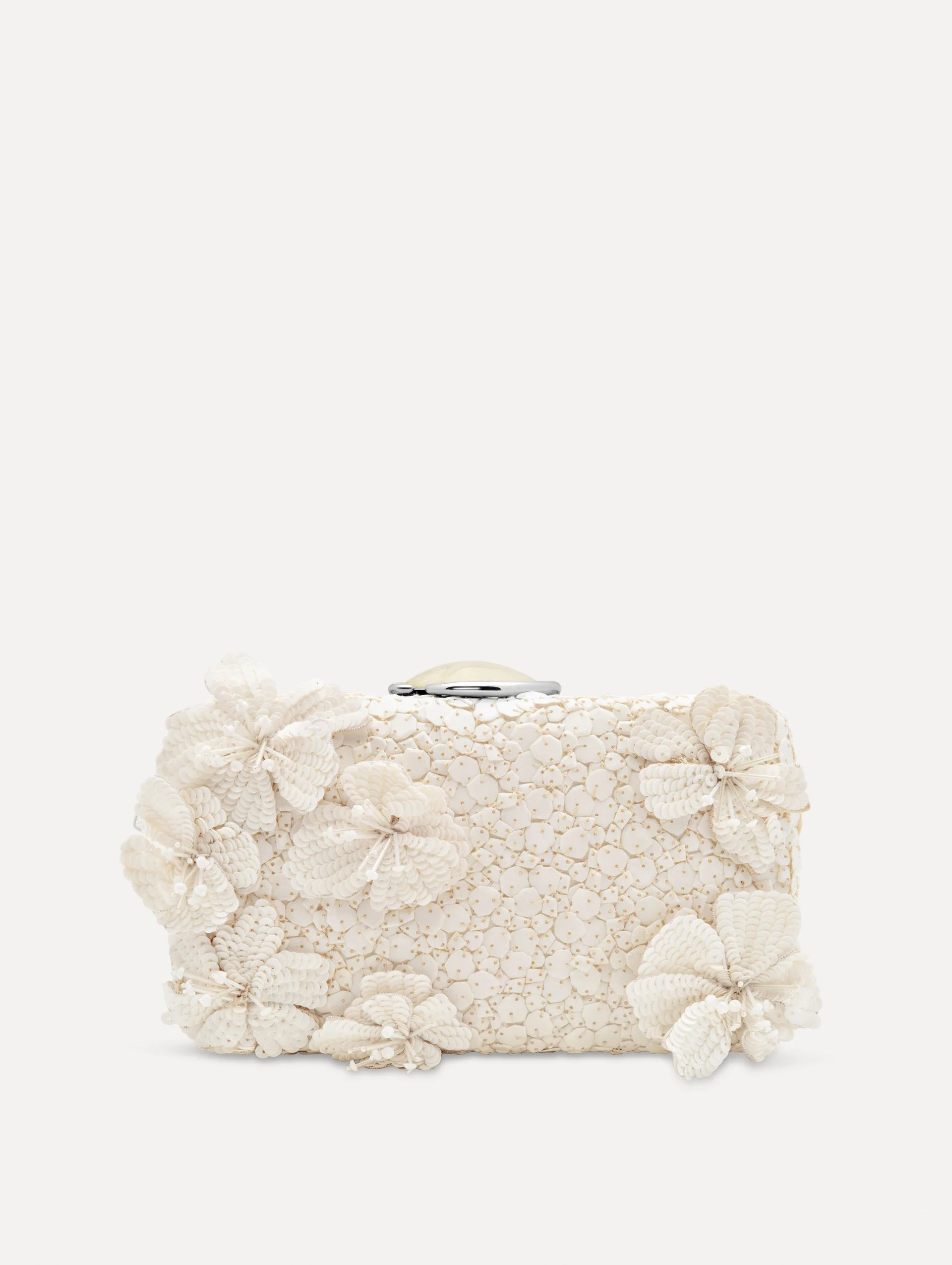 This timeless handbag captivates with its sleek, structured silhouette. Embroidered with mosaic sequins, delicate cherry blossoms intertwine across its form, creating a dazzling effect. It's finished with Oscar de la Renta's iconic 'O' emblem and resin cabochon at the clasp—a nod to the House's storied heritage. With a gold-tone detachable chain link shoulder strap, this piece effortlessly transitions into a clutch. Details - Dimensions: 20 cm x 11 cm x 4 cm - Weight: 395 grams - Chain Drop Length 21 cm - Lift-Up Closure - Detachable Shoulder Strap - Blush Nappa Leather Interior - Country of Origin: Italy - Style Code: 26RH1692EMB_WHT Materials & Care - 90% Plastic, 10% Brass - Take extra care when handling, as prongs on stones can catch on fabrics and may cause damage to woven clothing. - Avoid prolonged exposure to direct sunlight to prevent discoloration of fabrics or embellishments. - Keep away from heat sources to prevent damage to beading and embellishments. - Store in its original packaging, protected from light, heat, cold, and humidity. - Due to the delicate nature of the material, specialized cleaning is recommended. Please consult a specialist at Oscar de la Renta.