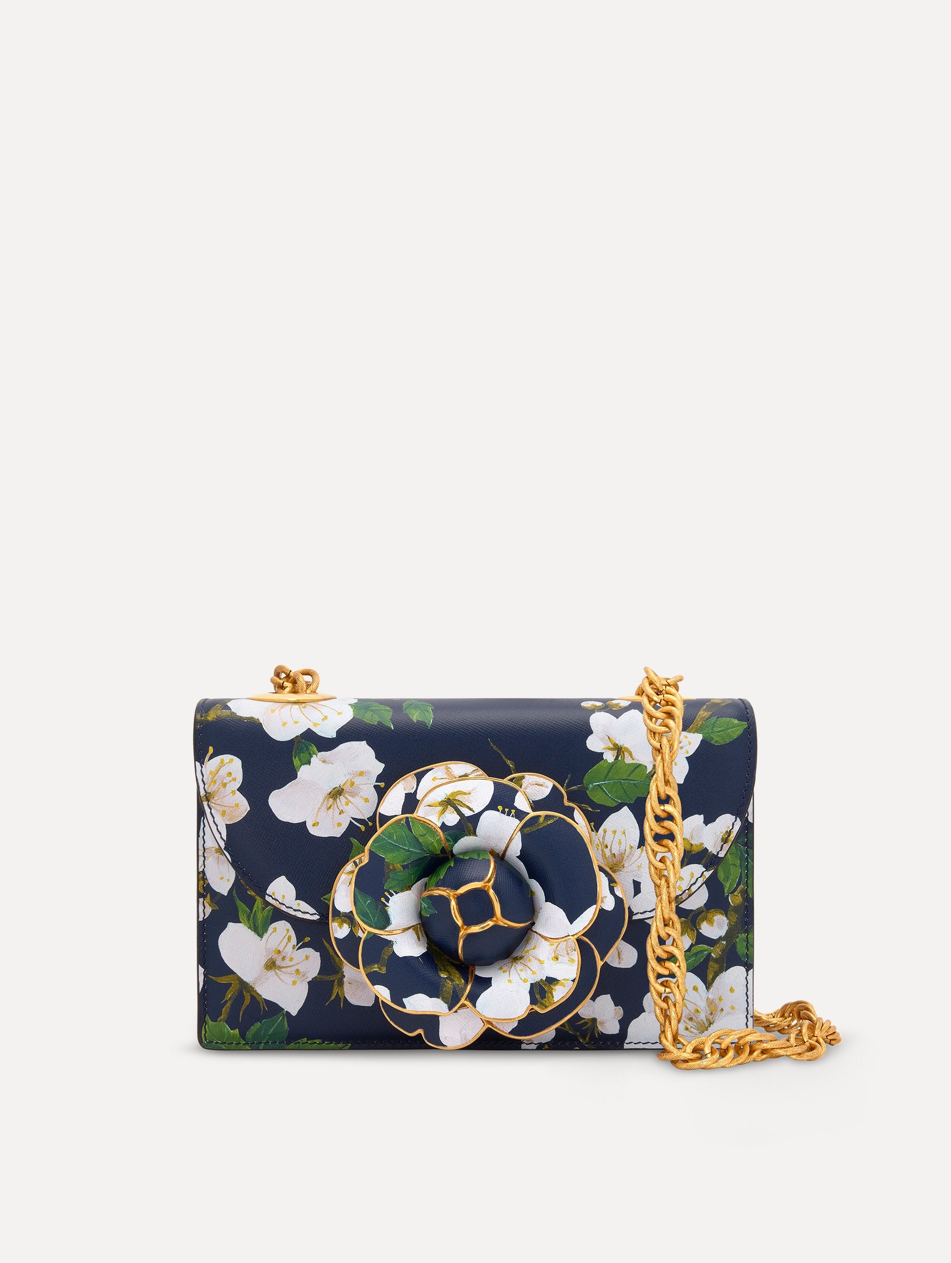 The classic TRO bag is reworked in eye-catching cherry blossom printed Saffiano leather with a detachable chain shoulder strap. The exquisite custom-created, metal-trimmed gardenia applique featured prominently at the front sets this handbag apart—making it the perfect companion for day or night. Details - Dimensions: 21 cm x 13.5 cm x 6.5 cm - Weight: 580 grams - Chain Length 120 cm - Drop Length 57.1 cm - Interior Pocket - Magnetic Closure - Detachable Chain Shoulder Strap - Light Taupe Microfiber Interior - Fits Up to an iPhone 16 Pro - Style Code: 25PH001SAF_NVY - Country of Origin: Italy Materials & Care - - 100% Calfskin - - Saffiano leather is an embossed calfskin grain leather that is generally resistant to scratches. - - Remove dust regularly with a dry or slightly damp cloth and allow to dry completely. - - Avoid prolonged exposure to direct sunlight to prevent discoloration. - - Keep away from heat sources to prevent the leather from drying out or becoming rigid. - - Store in its original packaging in a cool, dry place, protected from light, heat, and humidity. - - For oil stains, gently wash with water and mild soap. If needed, test a degreasing agent on a hidden area before applying. - - For other stains, wipe lightly with lukewarm water. If the stain persists, try using soapy water with a gentle touch.
