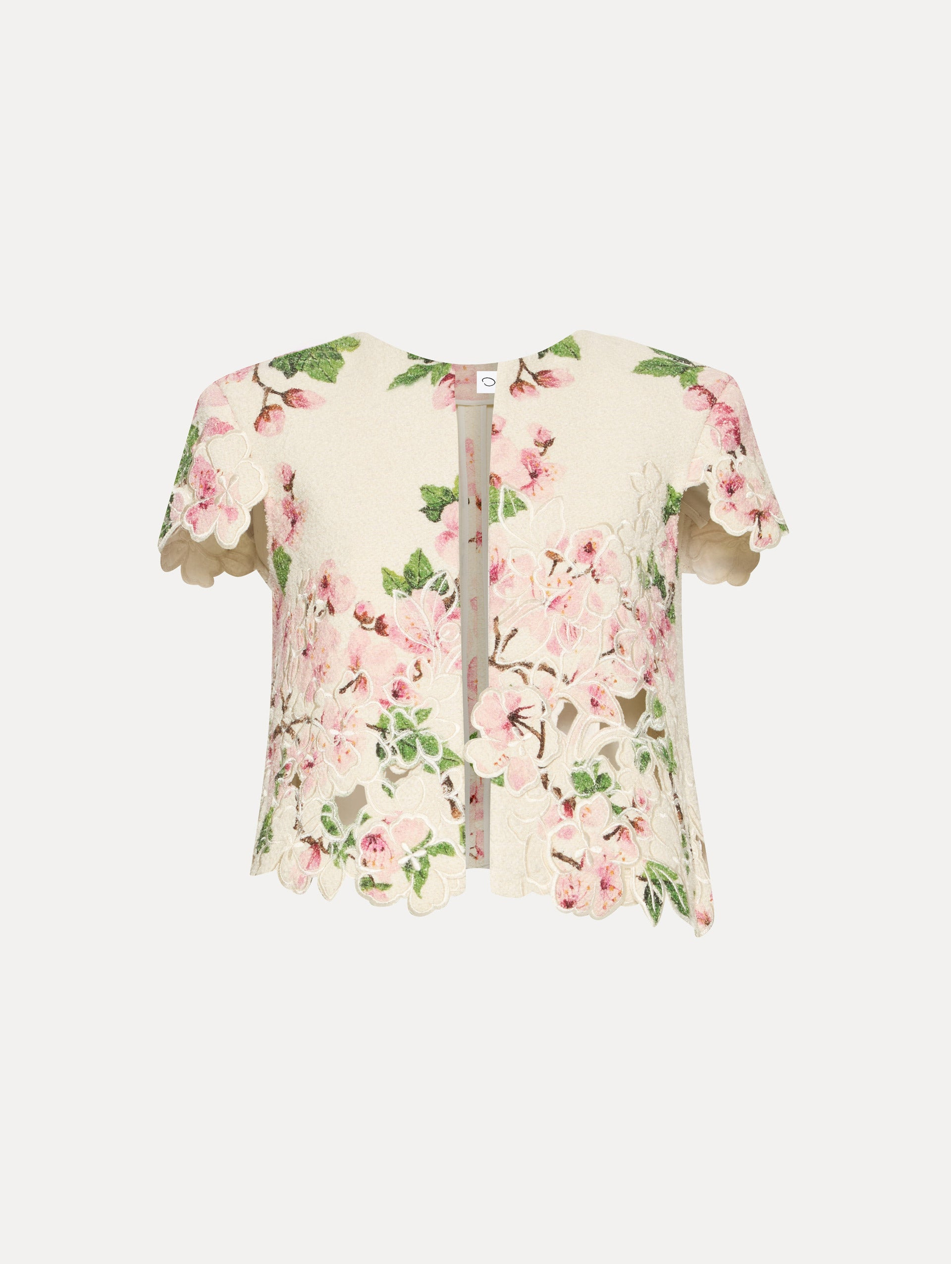 A classic silhouette meets artful embellishment, offering a refined take on botanical romance. This tweed jacket is finished with the season's Cherry Blossom motif and threadwork embroideries. Pair with the coordinating pencil skirt. Details - Short Sleeves with Shoulder Pads - Open Front - Cropped Silhouette - Unlined - Style Code: 25PE522CWW_PKV - Country of Origin: Italy Materials & Care - - 64% Cotton, 27% Virgin Wool, 9% Polyamide - - Spot clean only. - - Do not dry clean, iron, steam, bleach, or wash.