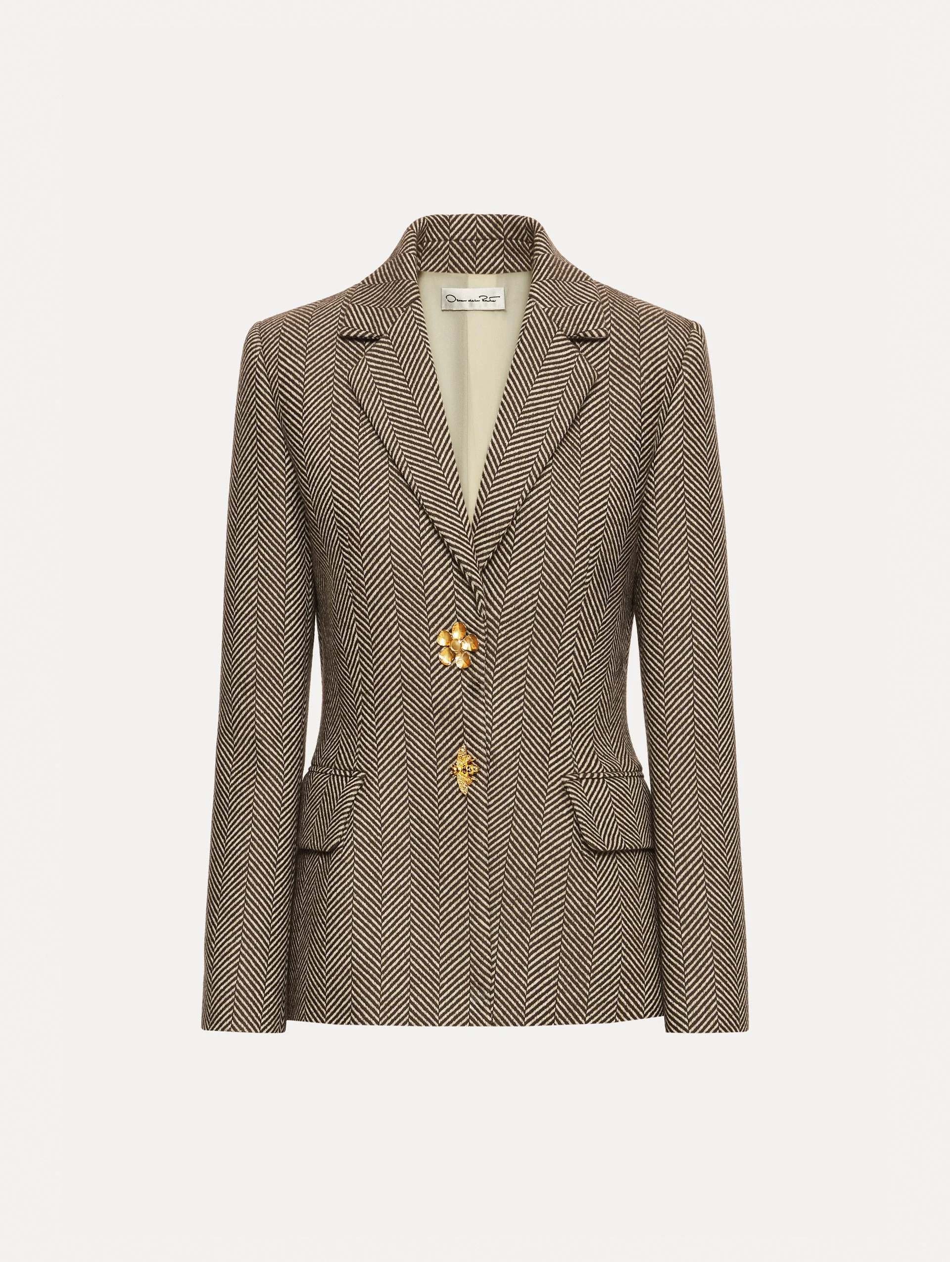 Cashmere-blend chevron lends this jacket its structured elegance, while precise tailoring creates a sharply defined silhouette. Gilded floral buttons punctuate the design with refined artistry, transforming a timeless piece into a statement of quiet sophistication. Details - Long Sleeves with Button Cuffs - Notch Lapels - Button Front - Front Flap Pockets - Gold-Tone Hardware - Single Vent - 100% Silk Lining - Country of Origin: Italy - Style Code: 26RN517OWS_WAN Materials & Care - 54% Virgin Wool, 46% Cashmere; Lining: 100% Silk - Dry clean only.