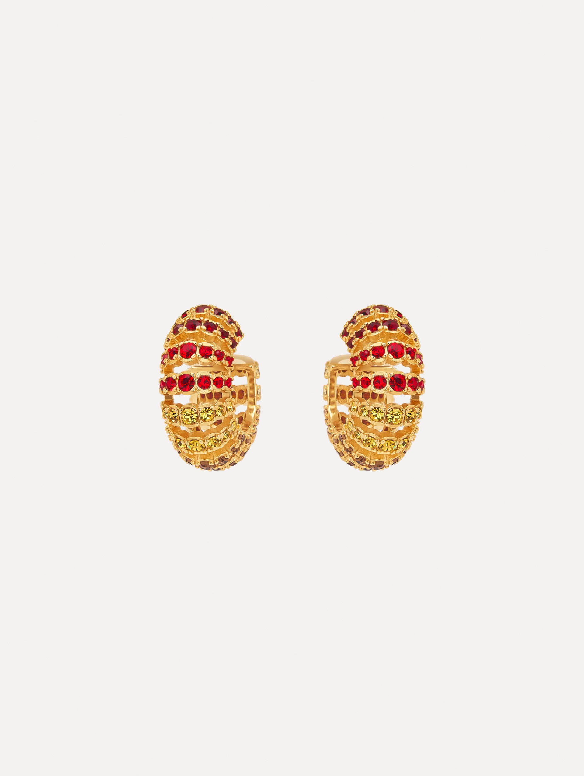 This hoop earrings feature arched rows of faceted crystals in a polished gold-tone setting. With their layered design and sculptural curve, the pair delivers a striking hit of sparkle. Details - Dimensions: 3 cm x 1.5 cm - Weight: 11 grams - Post Backs - For Pierced Ears - European Glass Crystals - Style Code: F25J9282_TPM - Country of Origin: Italy Materials & Care - - 97% Brass, 3% Crystal Glass - - Avoid exposing your jewelry to harsh chemicals. - - Lotions, cosmetics, hairspray and perfumes can cause chemical reactions that can cause the finish to deteriorate. - - Before handling, washing hands after applying makeup and hair products will help to preserve the finish. - - Do not wear in the pool, on the beach or in the shower. - - Wipe away dirt and body oils with a slightly damp microfiber jewelry cloth or cotton ball and allow to dry. - - Store separately in cloth pouches or small boxes to minimize scratching.