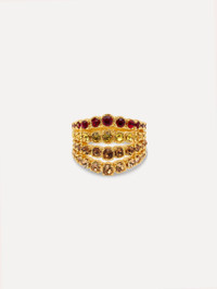 This bold ring features arched rows of faceted crystals set in a polished gold band. With its layered design and sculptural curve, it delivers a striking hit of sparkle. Details - Dimensions: 1.7 cm - Weight: 7 grams - European Glass Crystals - Style Code: F25J6062_TPM - Country of Origin: Italy Materials & Care - - 98% Brass, 2% Crystal Glass - - Avoid exposing your jewelry to harsh chemicals. - - Lotions, cosmetics, hairspray and perfumes can cause chemical reactions that can cause the finish to deteriorate. - - Before handling, washing hands after applying makeup and hair products will help to preserve the finish. - - Do not wear in the pool, on the beach or in the shower. - - Wipe away dirt and body oils with a slightly damp microfiber jewelry cloth or cotton ball and allow to dry. - - Store separately in cloth pouches or small boxes to minimize scratching.