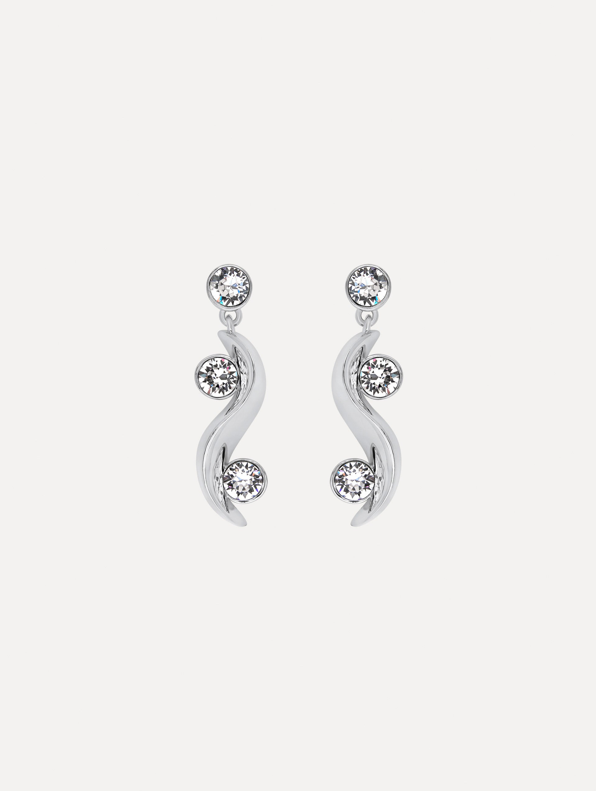 These earrings feature a silver-tone wave suspended from a single brilliant crystal, creating a graceful sense of movement. Accented with crystals along the curve, this sculptural design brings a refined sparkle to any look. Details - Dimensions: 5.5 cm x 1.5 cm - Weight: 11 grams - Post Backs - For Pierced Ears - European Glass Crystals - Style Code: F25J904_SIL - Country of Origin: Italy Materials & Care - - 98% Brass, 2% Crystal Glass - - Avoid exposing your jewelry to harsh chemicals. - - Lotions, cosmetics, hairspray and perfumes can cause chemical reactions that can cause the finish to deteriorate. - - Before handling, washing hands after applying makeup and hair products will help to preserve the finish. - - Do not wear in the pool, on the beach or in the shower. - - Wipe away dirt and body oils with a slightly damp microfiber jewelry cloth or cotton ball and allow to dry. - - Store separately in cloth pouches or small boxes to minimize scratching.
