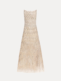 This cocktail dress is traced with a wave motif, each curve meticulously defined in crystal embroidery that shimmers with measured precision. Set on a delicate tulle base, the pattern flows in harmonious repetition, creating a sense of movement and dimension. Details - Sleeveless - Bateau Neckline - Concealed Back Zipper - Semi-Sheer - 100% Silk Lining - Country of Origin: USA - Style Code: 26RE640TUL_SIL Materials & Care - 100% Polyester; Lining: 100% Silk - Spot clean only - Do not dry clean, iron, steam, bleach, or wash