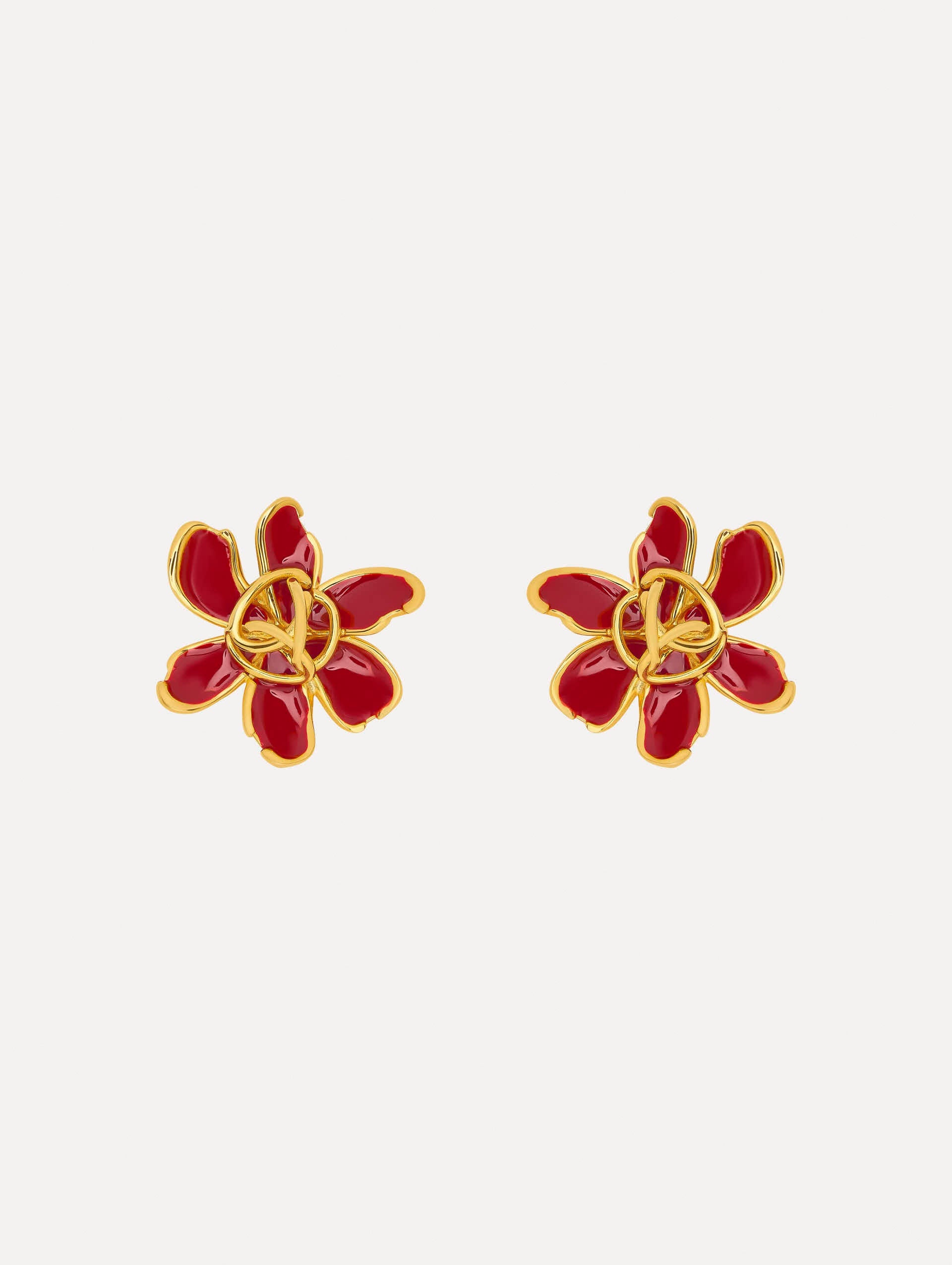 These enamel floral earrings hold a subtle surprise, with sculpted petals that echo the curves of the Oscar 'O' and a braided emblem at the center drawn from this season’s signature motif. Details - Dimensions: 34 mm x 36 mm - Weight: 16 grams - Post Backs / For Pierced Ears - Style Code: F25J933_BUR - Country of Origin: Italy Materials & Care - - 90% Brass, 10% Enamel - - Avoid exposing your jewelry to harsh chemicals. - - Lotions, cosmetics, hairspray and perfumes can cause chemical reactions that can cause the finish to deteriorate. - - Before handling, washing hands after applying makeup and hair products will help to preserve the finish. - - Do not wear in the pool, on the beach or in the shower. - - Wipe away dirt and body oils with a slightly damp microfiber jewelry cloth or cotton ball and allow to dry. - - Store separately in cloth pouches or small boxes to minimize scratching.