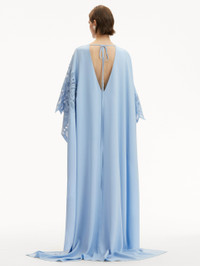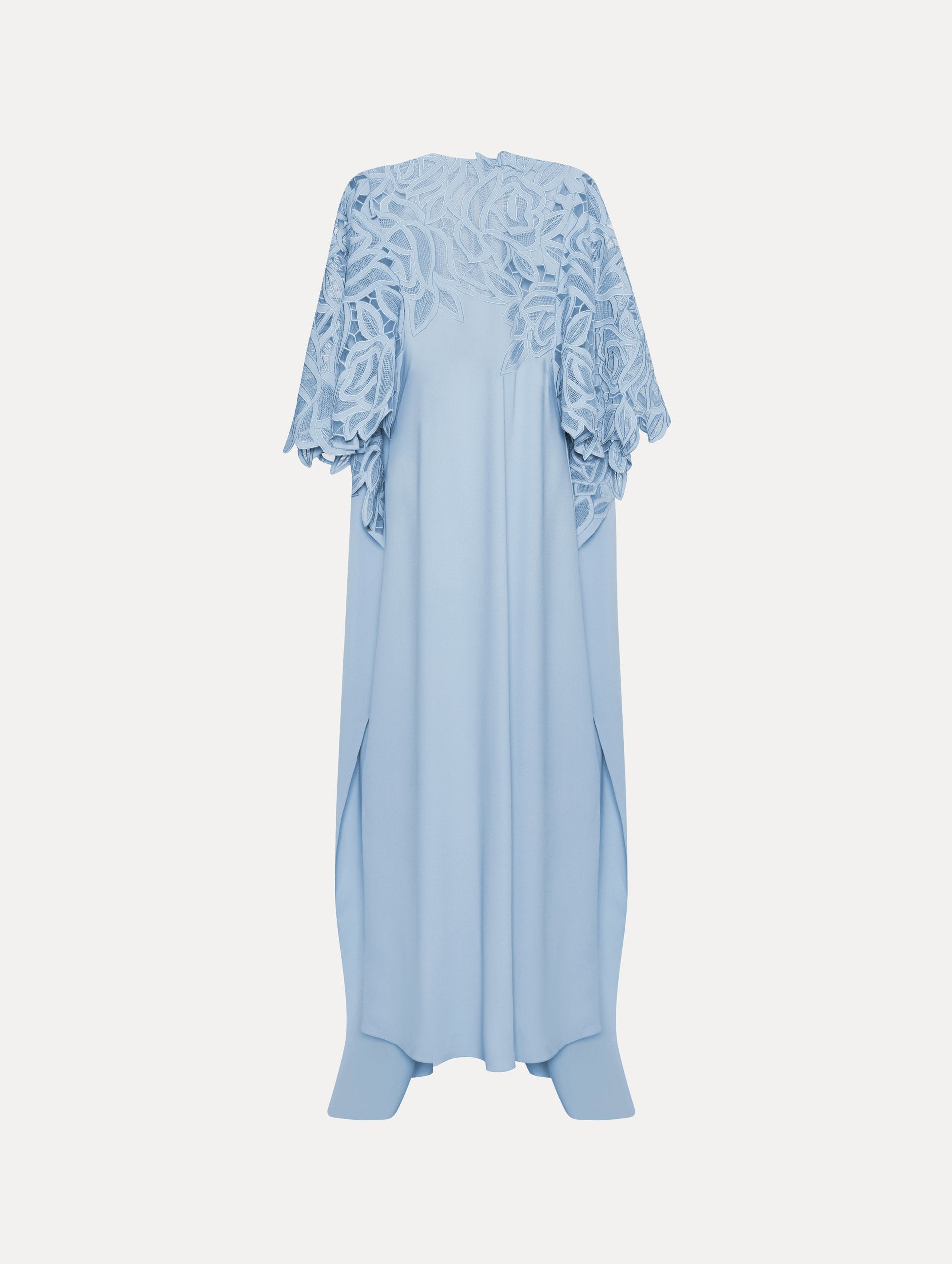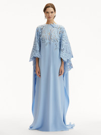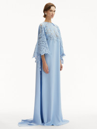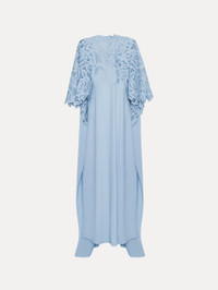 This caftan offers a new iteration of this season's painterly English Rose motif. Climbing florals are realized through guipure lace cutouts in heavy silk stretch georgette. Details - Cape Back - Open Back with Self-Tie Closure - Jewel Neckline - Relaxed Silhouette - Floor-Sweeping Hemline - Pullover Style - Unlined - Style Code: 25SE901HSG_OPA - Country of Origin: India Materials & Care - 94% Silk, 6% Elastane