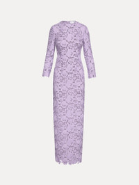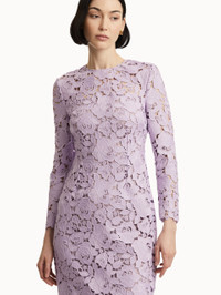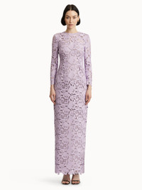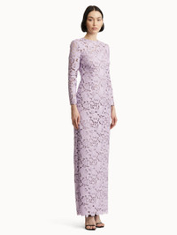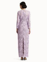Crafted entirely from intricate English rose guipure lace, this gown exudes elegance with its timeless silhouette and long sleeves. The floral lace adds a striking texture, combining sophistication with a modern touch. Details - Long Sleeves - Jewel Neckline - Column Silhouette - Floor-Sweeping Hemline - Concealed Back Zipper - 100% Silk Lining - Style Code: 25SN059RGP_THI - Country of Origin: Italy Materials & Care - 100% Polyester; Lining: 100% Silk