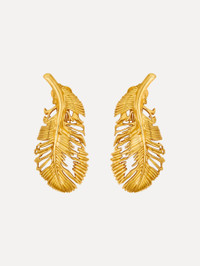 Delicately sculpted in polished gold, these earrings capture the graceful movement of a feather midair. Intricate cutwork and refined texture lend a sense of lightness, while their sweeping silhouette offers a bold yet effortless finish. Details - Dimensions: 65 mm x 30 mm - Weight: 13.8 grams - Clip Back with Comfort Pads - Country of Origin: Italy - Style Code: R26J954_GOL Materials & Care - 99% Brass, 1% Gold" - Avoid exposing your jewelry to harsh chemicals. - Lotions, cosmetics, hairspray and perfumes can cause chemical reactions that can cause the finish to deteriorate. - Before handling, washing hands after applying makeup and hair products will help to preserve the finish. - Do not wear in the pool, on the beach or in the shower. - Wipe away dirt and body oils with a slightly damp microfiber jewelry cloth or cotton ball and allow to dry. - Store separately in cloth pouches or small boxes to minimize scratching.