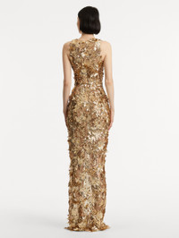 Gold-embroidered feathers unfurl across an ethereal tulle base, creating a striking interplay of texture and light. This sleeveless gown stuns with its illusion details, while a daring high front slit adds movement and allure. Details - Sleeveless - Halter Neckline - Front Slit - Concealed Back Zipper - Internal Bustier - Semi-Sheer - Lined - Style Code: 25FE015TUL_GOL - Country of Origin: USA Materials & Care - - 100% Polyamide; Lining: 100% Silk - - Spot clean only. - - Do not dry clean, iron, steam, bleach, or wash.