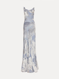 The season’s defining motif is artfully rendered in plush texture against a diaphanous ground. The sculpted bodice, adorned with delicate floral appliques at the neckline, flows seamlessly into a floor-sweeping skirt, creating a silhouette that moves with fluid grace. Details - Strapless - Sweetheart Neckline - Floor-Sweeping Hemline with Short Train - Concealed Side Zipper - Unlined - Country of Origin: USA - Style Code: 26RE047FVN_SSL Materials & Care - 61% Viscose, 26% Polyester, 12% Polyamide, 1% Elastane - Spot clean only - Do not dry clean, iron, steam, bleach, or wash