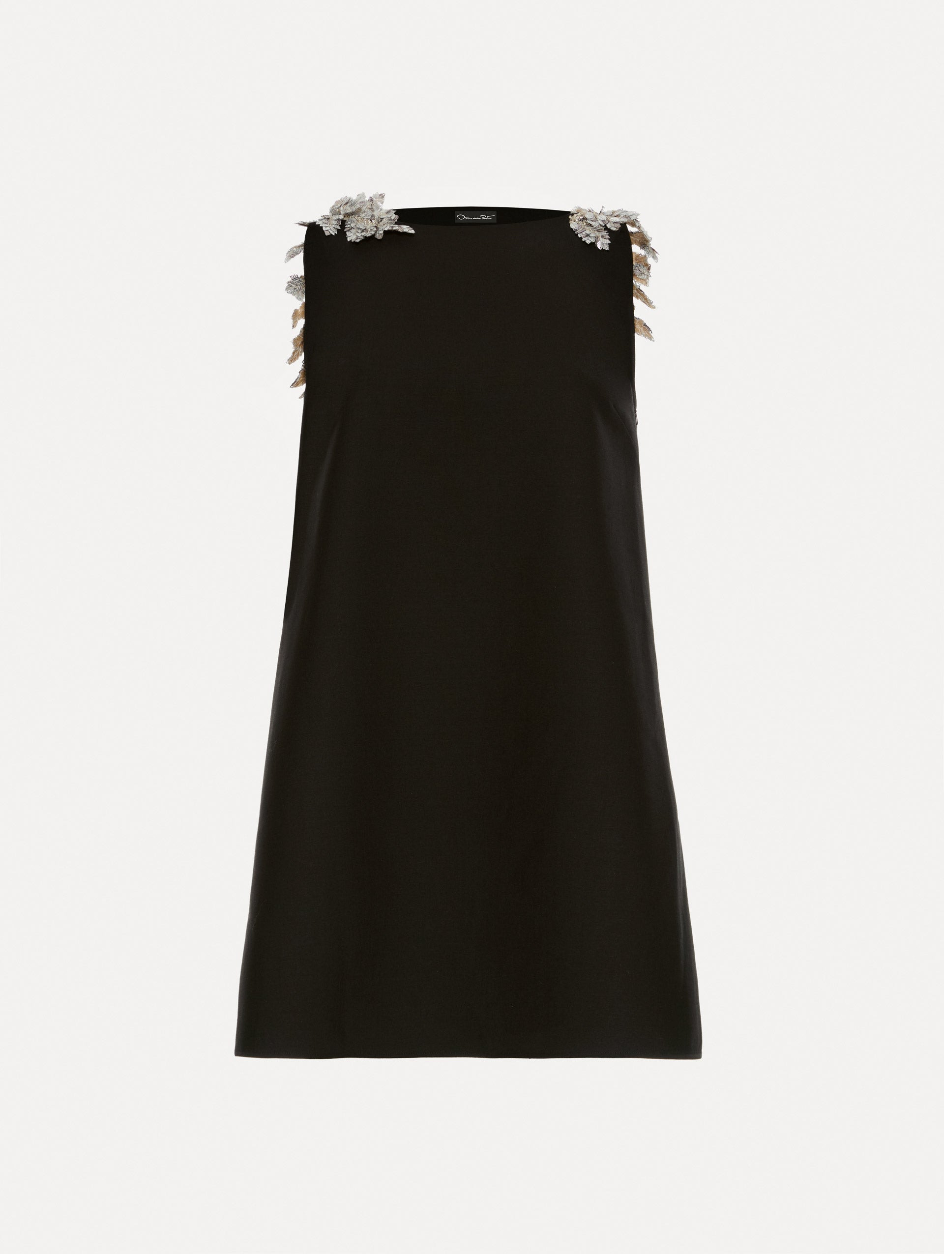 This minidress, rendered in double-faced stretch wool, features a shift silhouette that drapes effortlessly. An elegantly scooped back is framed by fern embroidery, each frond rendered in glistening sequins that catch the light with every movement. Details - Sleeveless - Bateau Neckline - Shift Silhouette - Open Back - Concealed Side Zipper - Lined - Style Code: 25FE632DSW_BLK - Country of Origin: Italy Materials & Care - - 94% Virgin Wool, 5% Elastane, 1% Polyamide - - Spot clean only. - - Do not dry clean, iron, steam, bleach, or wash.