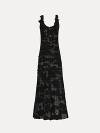 Cutout floral threadwork embroidery unfurls across the gown in a lattice of artistry, forming a flower-filled trellis that dances over the skin. Each blossom is meticulously rendered, its petals layered with depth and dimension, while the openwork ground lends an airy lightness to the gown’s sculpted form. Details - Sleeveless - Square Neckline - Trumpet Silhouette - Floor-Sweeping Hemline with Short Train - Concealed Back Zipper - Semi-Sheer - Country of Origin: USA - Style Code: 26RE017DSW_BLK Materials & Care - 100% Polyamide; Self: 94% Virgin Wool, 5% Elastane, 1% Polyamide - Spot clean only - Do not dry clean, iron, steam, bleach, or wash