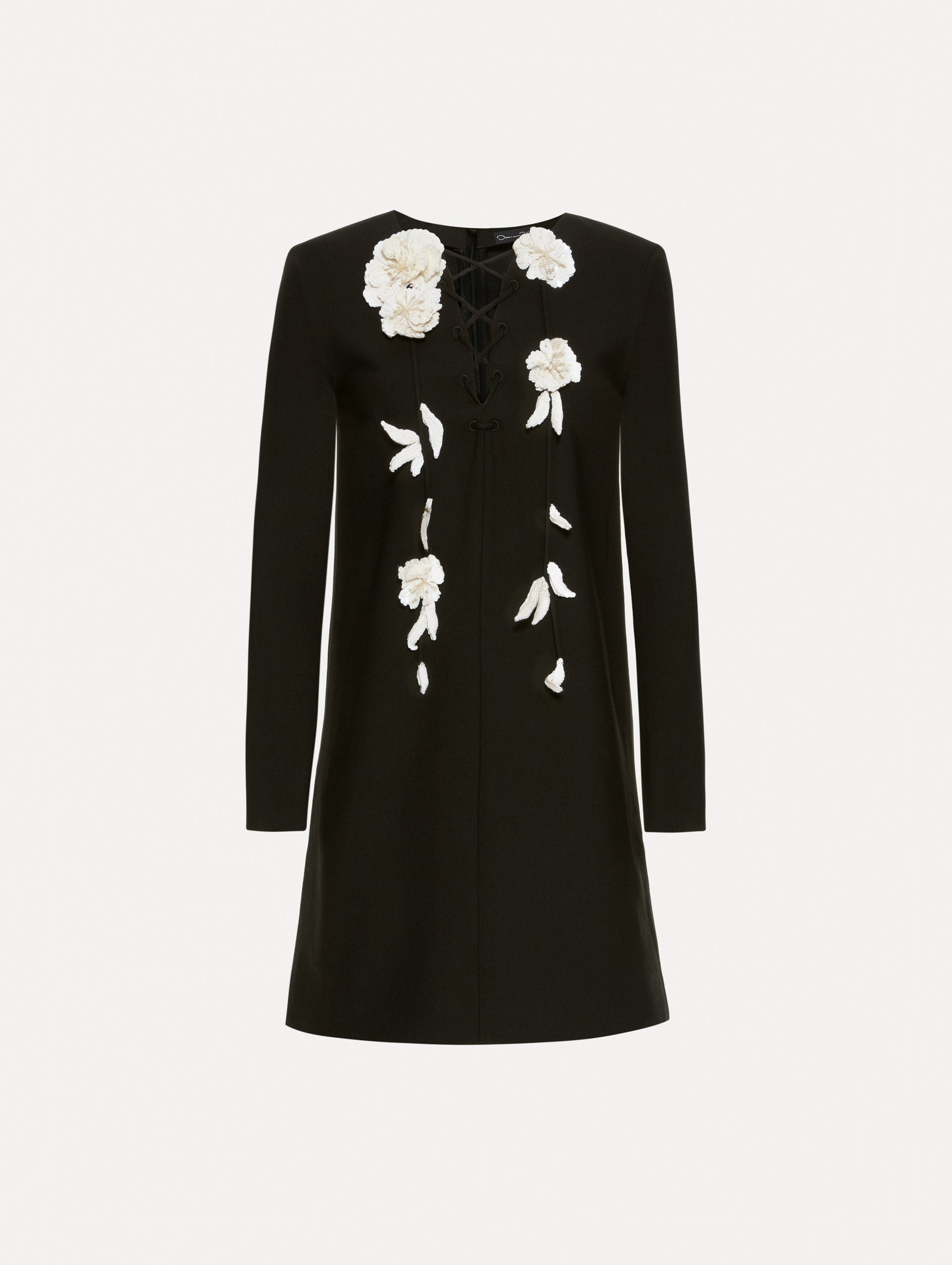Cut from double-faced stretch wool in black, this minidress is defined by its shift silhouette and long sleeves. A refined lace-up neckline adds a sense of ease and femininity, punctuated by delicately embroidered sequin floral appliques. Details - Long Sleeves - V-Neckline with Self-Tie Closure - Shift Silhouette - Concealed Back Zipper - Unlined - Style Code: 25FE236DSW_BLK - Country of Origin: Italy Materials & Care - - 94% Virgin Wool, 5% Elastane, 1% Polyamide - - Spot clean only. - - Do not dry clean, iron, steam, bleach, or wash.