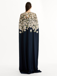 A celebration of texture and technique, this caftan transforms beloved florals into sequin embroidery. With its relaxed silhouette and cape back, the design brings sculptural elegance and playful charm to every detail. Details - Cape Back - Illusion Neckline - Concealed Back Zipper - Unlined - Style Code: 25FE9152SRY_NAV - Country of Origin: India Materials & Care - 97% Viscose, 3% Elastane; Lining: 94% Silk, 6% Elastane; Base: 100% Polyamide - Spot clean only. - Do not dry clean, iron, steam, bleach, or wash.