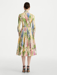 Tailored from crisp cotton poplin, this dress blooms with a vivid foxglove print that sweeps across its fitted bodice and pleated midi skirt. A soft bow frames the neckline, while three-quarter sleeves add a refined finish to its feminine silhouette. Details - Three-Quarter-Length Sleeves with Button Cuffs - Self-Tie Neckline - Removeable, Coordinating Buckle Belt - Side Seam Pockets - Concealed Side Zipper - Unlined - Country of Origin: Italy - Style Code: 26RN229FXC_WMU Materials & Care - 97% Cotton, 3% Elastane - Dry clean only.