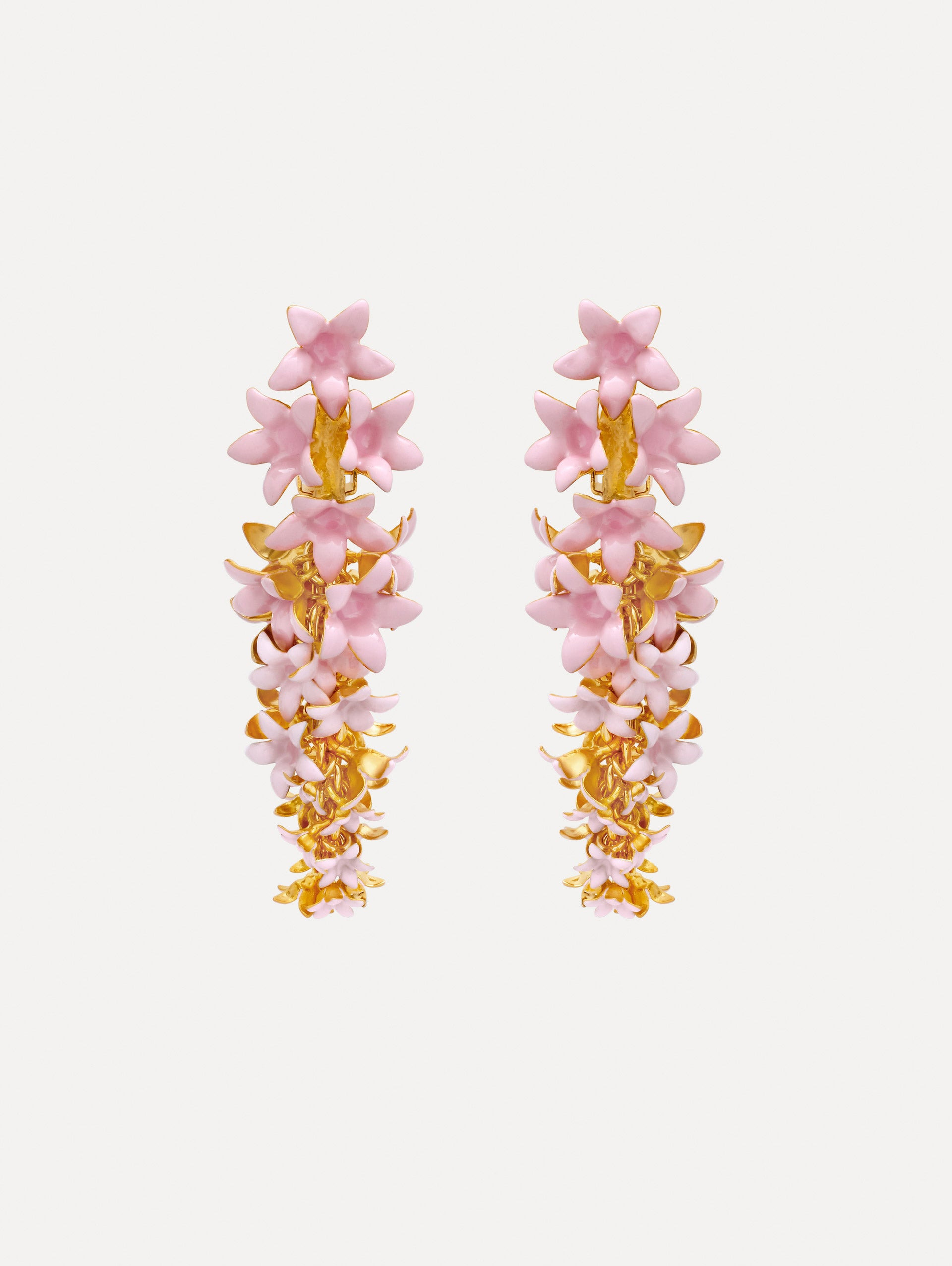 A cascading arrangement of foxglove blooms, these earrings blend vivid orchid pink with polished gold-tone petals in a sculptural drop silhouette. Pair with swept-back hair to keep their statement in focus. Details - Dimensions: 80 mm x 25 mm - Weight: 25 grams - Post Backs - For Pierced Ears - Country of Origin: Italy - Style Code: R26J935_PNK Materials & Care - 90% Brass, 9% Enamel, 1% Gold - Avoid exposing your jewelry to harsh chemicals. - Lotions, cosmetics, hairspray and perfumes can cause chemical reactions that can cause the finish to deteriorate. - Before handling, washing hands after applying makeup and hair products will help to preserve the finish. - Do not wear in the pool, on the beach or in the shower. - Wipe away dirt and body oils with a slightly damp microfiber jewelry cloth or cotton ball and allow to dry. - Store separately in cloth pouches or small boxes to minimize scratching.