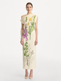 Cut from soft jersey, this dress features a foxglove and dandelion motif in a striking interplay of line drawing and vivid color. The partially sketched design lends an artful, in-progress quality, as if the blooms have just begun to come to life across the one-shoulder silhouette. Details - Off Shoulder - Slim Fit - Concealed Side Zipper - Unlined - Country of Origin: Italy - Style Code: 26RN251FDI_BUI Materials & Care - 94% Viscose, 6% Elastane - Dry clean only."}]}]}