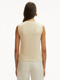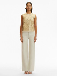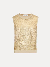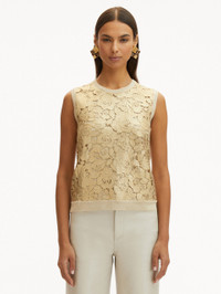 This classic tank features an English rose guipure lace paneled front with gold foil detailing. This piece is a perfect pairing for color-complementary separates or its coordinating cardigan for optimal versatility. Details - Sleeveless - Round Neckline - Slim Fit - Hip Length - Pullover Style - Ribbed Trim - Unlined - Style Code: 25SN154GFI_LBE - Country of Origin: Italy Materials & Care - 55% Silk, 45% Viscose; Combo Lace: 100% Polyester