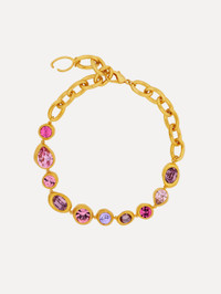 Framed in hammered gold-tone settings, a mix of faceted stones in varying shades forms the focal point of this statement necklace. Anchored by oversized chain links, it strikes a balance between bold structure and soft, radiant color. Details - Dimensions: 42 cm - Weight: 75 grams - Lobster Clasp - Country of Origin: Italy - Style Code: R26J824_ROS Materials & Care - 92% Brass, 8% Glass - Avoid exposing your jewelry to harsh chemicals. - Lotions, cosmetics, hairspray and perfumes can cause chemical reactions that can cause the finish to deteriorate. - Before handling, washing hands after applying makeup and hair products will help to preserve the finish. - Do not wear in the pool, on the beach or in the shower. - Wipe away dirt and body oils with a slightly damp microfiber jewelry cloth or cotton ball and allow to dry. - Store separately in cloth pouches or small boxes to minimize scratching.