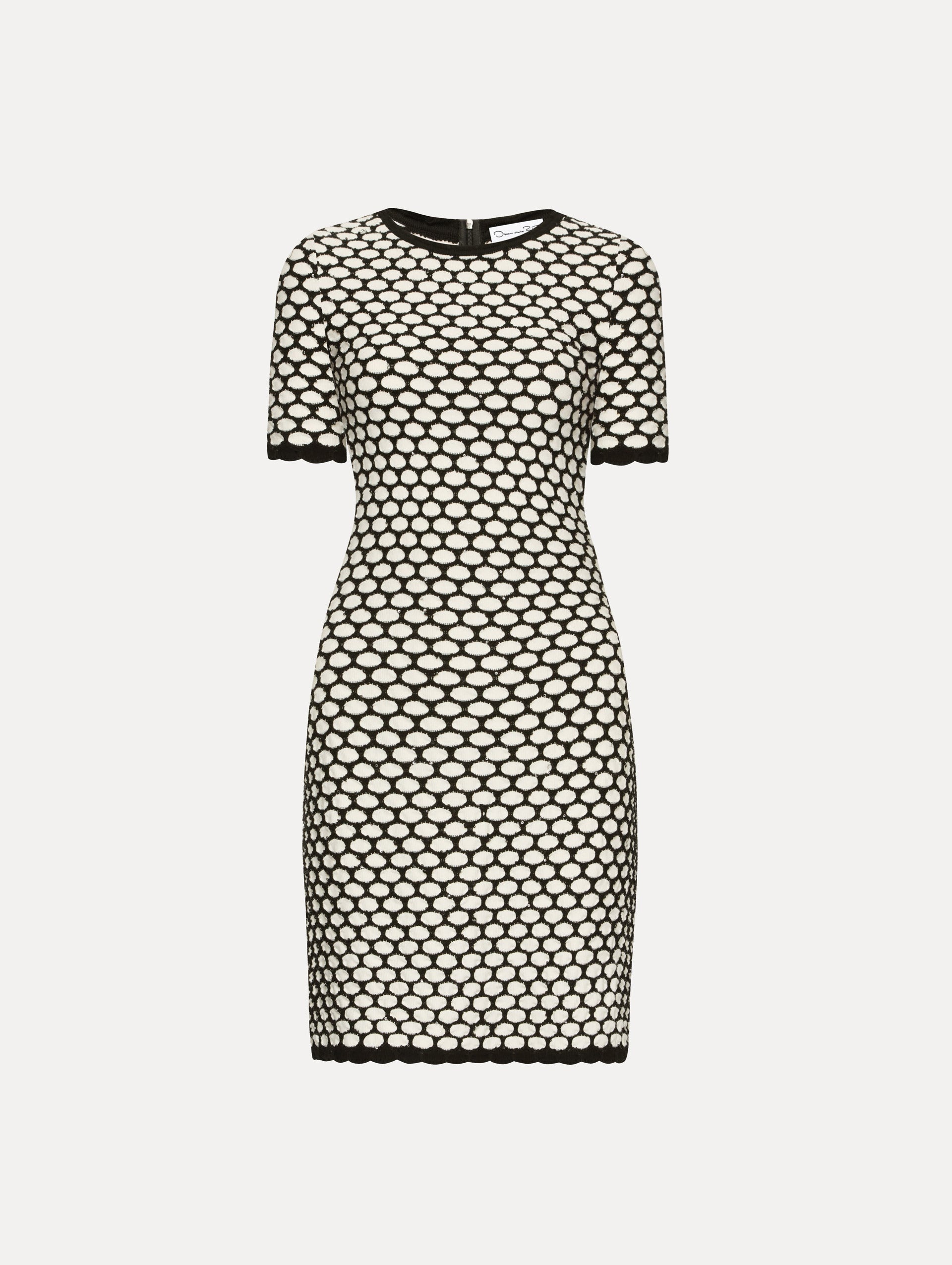 Especially dynamic with a honeycomb pattern and sequin detailing, this fit-and-flare dress is a comfortable and effortless piece designed to enhance. Pair with its coordinating cardigan for optimal versatility. Details - Short Sleeves - Jewel Neckline - Fit-and-Flare Silhouette - Concealed Back Zipper - Unlined - Style Code: 25PN161HBW_WHB - Country of Origin: Italy Materials & Care - 57% Viscose, 29% Polyester, 14% Silk