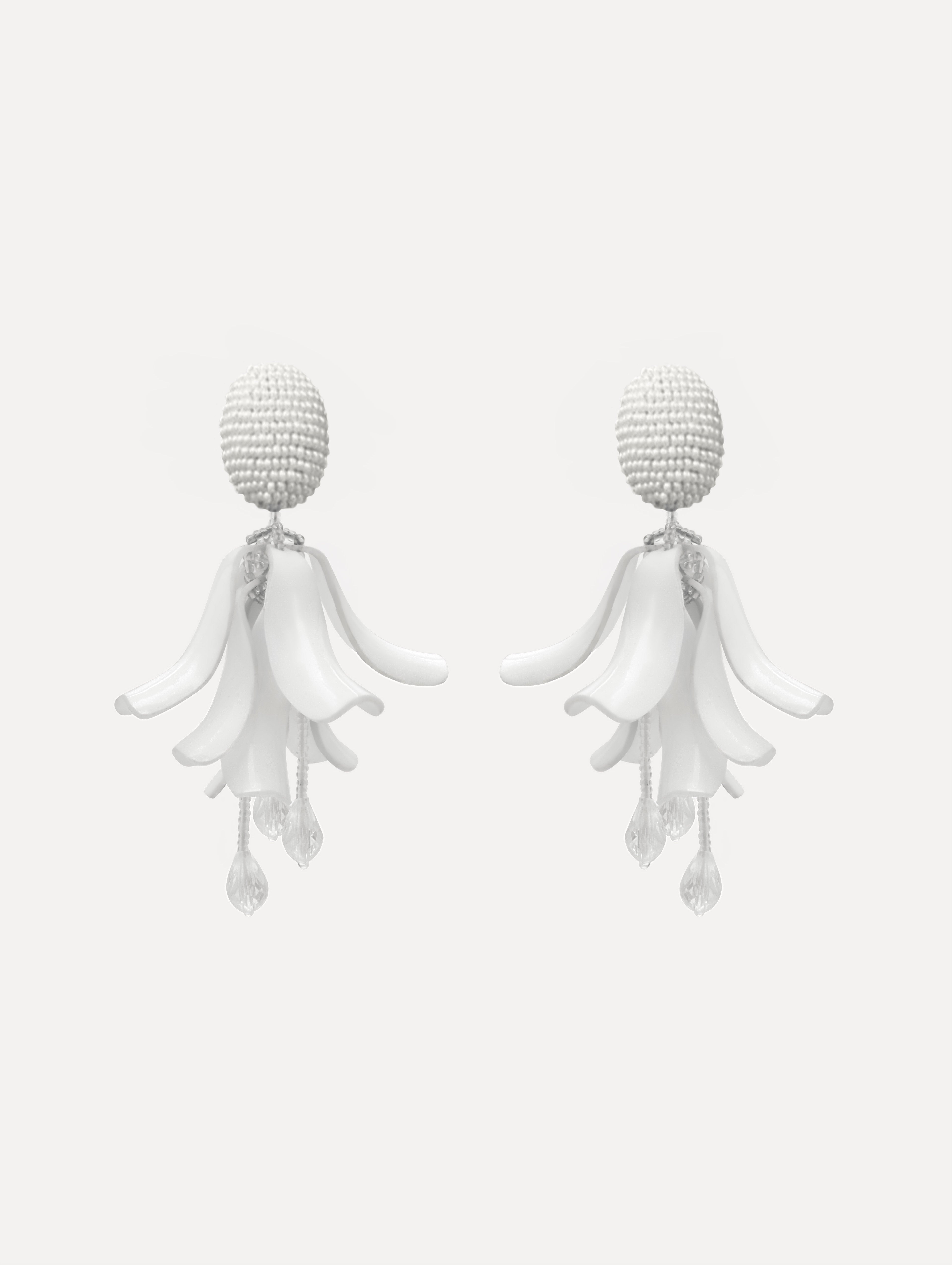 A perennial favorite, these earrings capture the graceful form of the impatiens blossom in full bloom. Sculpted petals cascade with fluid movement, anchored by a beaded stud and finished with delicate crystal drops. Details - Dimensions: 8.3 cm x 4 cm - Weight: 18 grams - Clip Back with Comfort Pads - Country of Origin: India - Style Code: R26J199_IVR Materials & Care - 55% Acrylic, 20% Glass, 10% Viscose, 10% Polyester, 5% Brass - Avoid exposing your jewelry to harsh chemicals. - Lotions, cosmetics, hairspray and perfumes can cause chemical reactions that can cause the finish to deteriorate. - Before handling, washing hands after applying makeup and hair products will help to preserve the finish. - Do not wear in the pool, on the beach or in the shower. - Wipe away dirt and body oils with a slightly damp microfiber jewelry cloth or cotton ball and allow to dry. - Store separately in cloth pouches or small boxes to minimize scratching.
