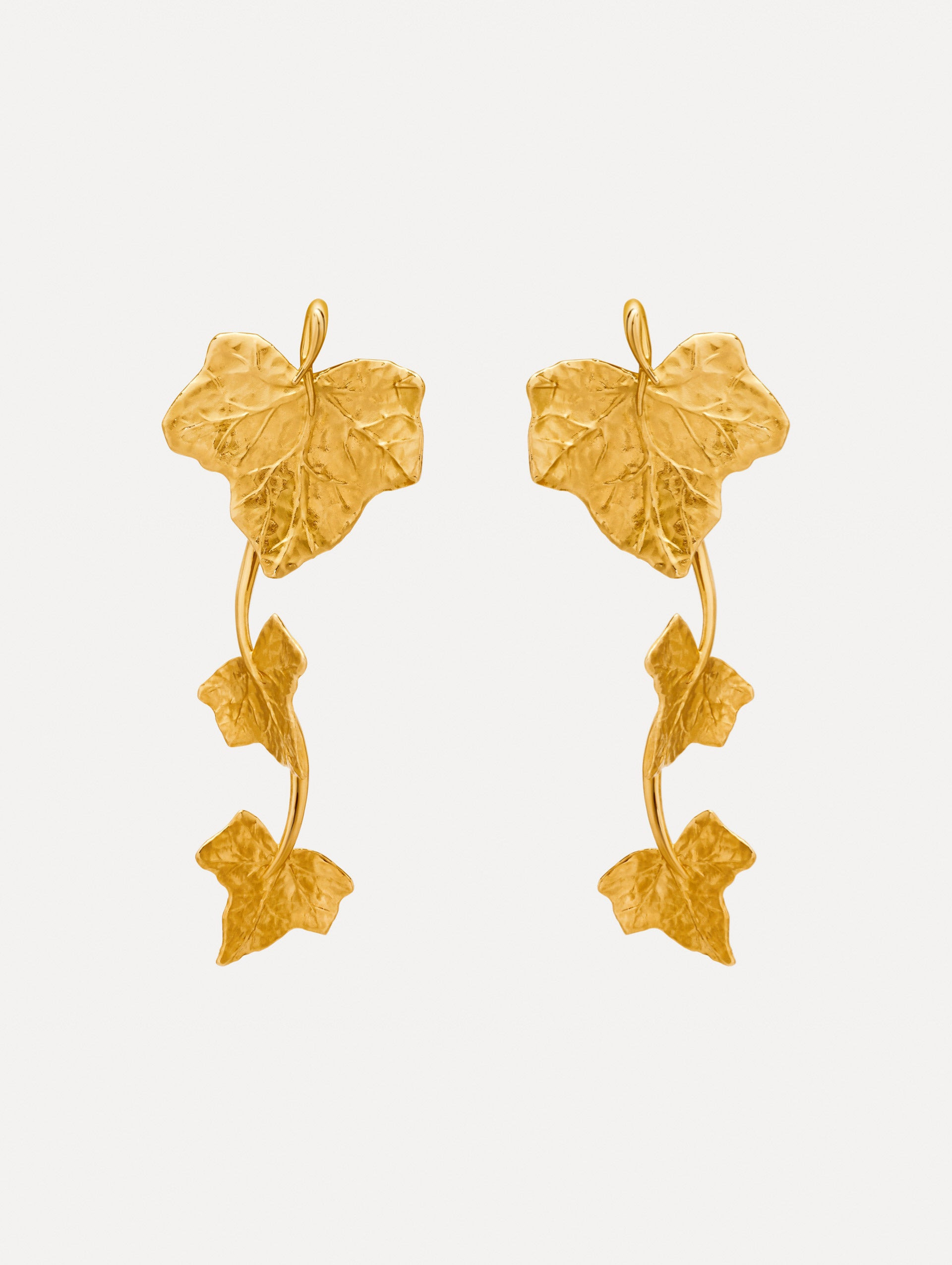 Golden ivy leaves fall in a graceful triple drop, their sculpted texture capturing the organic beauty of nature with a refined, modern finish. Pair with the coordinating necklace. Details - Dimensions: 36 mm x 94 mm - Weight: 48 grams - Clip Back with Comfort Pads - Country of Origin: Italy - Style Code: R26J930_GOL Materials & Care - 100% Brass - Avoid exposing your jewelry to harsh chemicals. - Lotions, cosmetics, hairspray and perfumes can cause chemical reactions that can cause the finish to deteriorate. - Before handling, washing hands after applying makeup and hair products will help to preserve the finish. - Do not wear in the pool, on the beach or in the shower. - Wipe away dirt and body oils with a slightly damp microfiber jewelry cloth or cotton ball and allow to dry. - Store separately in cloth pouches or small boxes to minimize scratching.