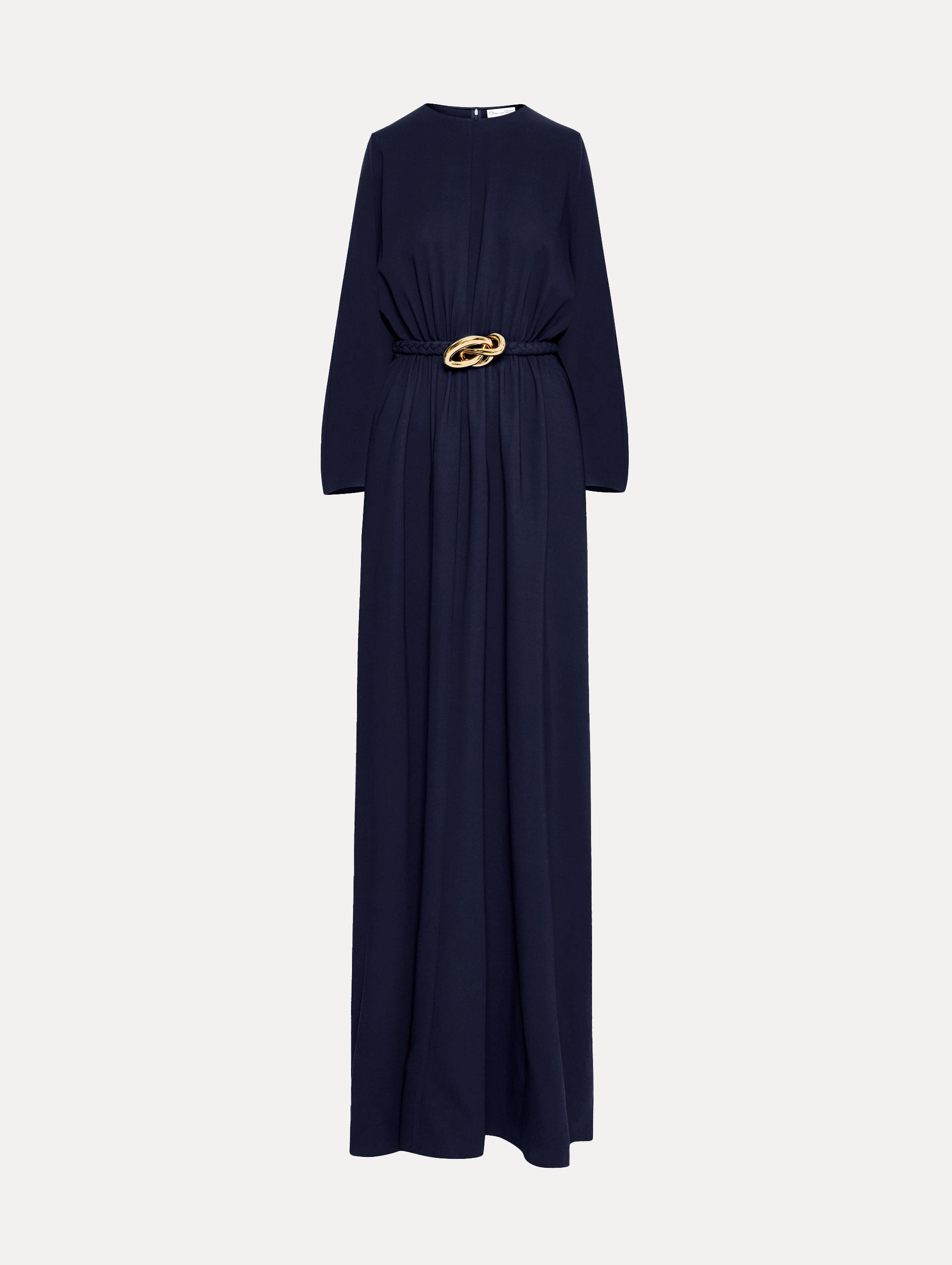Cut from heavy silk stretch georgette, this caftan drapes effortlessly with long sleeves and a flowing silhouette that exudes understated elegance. A sculptural gold-tone knotted belt cinches the waist, adding a polished finishing touch. Details - Long Sleeves - Jewel Neckline - Relaxed Silhouette - Removable, Coordinating Novelty Belt - Floor - Sweeping Hemline - Concealed Back Zipper - Gold-Tone Hardware - Unlined - Style Code: 25PN907HSG_NAV - Country of Origin: USA Materials & Care - 94% Silk, 6% Elastane