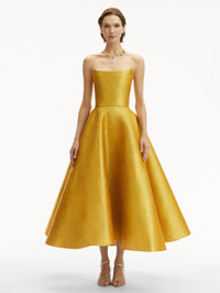 The ultimate drama of the collection, this tea length dress is spun with metallic gold thread. Complete with a bustier bodice and feminine full skirt, this cocktail dress is sure to capture attention. Details - Strapless - Fit-and-Flare Silhouette - Below the Knee Length - Concealed Back Zipper - Internal Waistband with Hook-and-Bar Closure - Petticoat - Lined - Style Code: 25SE040ORG_YGO - Country of Origin: USA Materials & Care - 100% Silk; Petticoat: 100% Polyamide