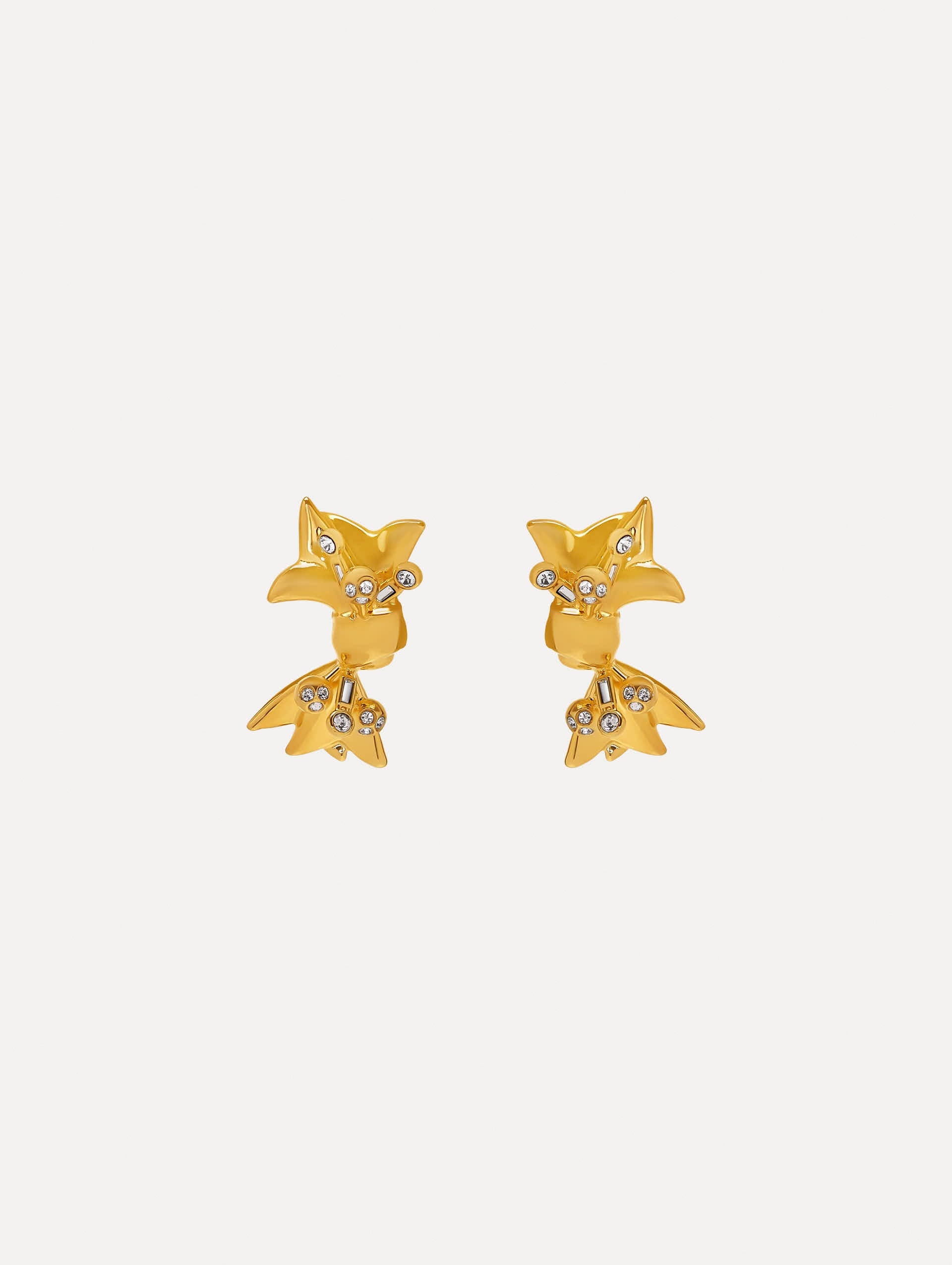 These gold earrings are sculpted into a distinct mill bow design, inspired by the art of millinery. The elegant, fanned shape is accented with glass crystals in varying cuts, adding a refined touch of sparkle. Details - Dimensions: 3.5 cm x 2 cm - Weight: 19 grams - Clip Backs with Comfort Pads - European Glass Crystals - Style Code: P25J905_GOL - Country of Origin: Italy Materials & Care - 98% Brass, 2% Crystal Glass