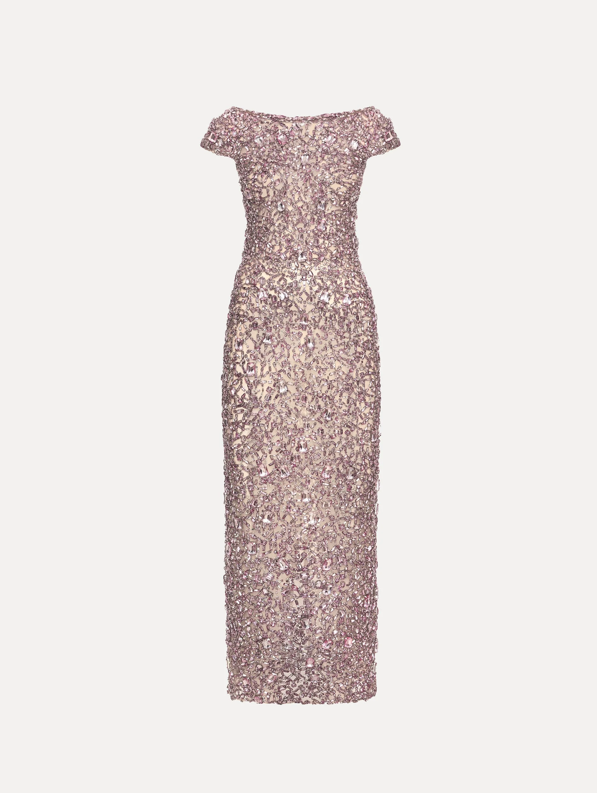 This gown is richly adorned in an allover embroidery of mixed crystals, each stone meticulously placed to form a luminous mosaic. The cap sleeves and column silhouette serve as a refined backdrop, allowing the jeweled surface to command attention in a radiant study of light and texture. Details - Cap Sleeves - Bateau Neckline - Open Back - Concealed Back Zipper - Center Back Slit - 100% Silk Lining - Country of Origin: USA - Style Code: 26RE650TUL_PIN Materials & Care - 100% Polyamide; Lining: 100% Silk - Spot clean only - Do not dry clean, iron, steam, bleach, or wash