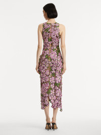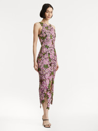 Thousands of hand-placed sequins form a mosaic of blooming florals, each petal and leaf outlined in rich contrast for sculptural dimension. The embroidery drapes gracefully over a sleeveless cocktail dress with a sheer illusion tulle base, while the skirt cascades into an asymmetrical hem for a fluid, dynamic finish. Details - Sleeveless - Concealed Back Zipper - Internal Bustier - Semi-Sheer - Lined - Style Code: 25FE622TUL_LLM - Country of Origin: USA Materials & Care - 100% Polyamide; Lining: 100% Silk - Spot clean only. - Do not dry clean, iron, steam, bleach, or wash.