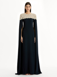 Crafted from silk georgette, this caftan is defined by sweeping cape sleeves and a neckline adorned with hand-embroidered mother-of-pearl and crystal blossoms. Luminous and sculptural, it brings a sense of refined grandeur to an otherwise minimalist silhouette. Details - Long Cape Sleeves - Jewel Neckline - Concealed Back Zipper with Keyhole Closure - Relaxed Silhouette - Floor-Sweeping Hemline - 100% Silk Lining - Country of Origin: India - Style Code: 26RE920HSG_NAV Materials & Care - 94% Silk, 6% Elastane; Lining: 100% Silk - Spot clean only. - Do not dry clean, iron, steam, bleach, or wash.