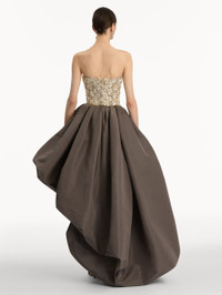 An expression of refined opulence, this gown features intricate blossoms of mother-of-pearl and crystals meticulously hand-applied across the fitted bodice. The luminous embroidery contrasts against a voluminous skirt, creating a striking balance of structure and fluidity. Details - Strapless - High-Low Hemline with Short Train - Concealed Back Zipper - Lined - Country of Origin: USA - Style Code: 26RE036FAI_STN Materials & Care - 100% Polyamide; Self: 100% Silk - Spot clean only - Do not dry clean, iron, steam, bleach, or wash